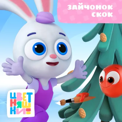 Откроем белую страничку нашего волшебного альбома? Здесь красиво искрится снег и прыгает Зайчонок Скок – «белый хвостик и бочок». Зайчонок очень любит рисовать. «Альбом и краски со мной навсегда!» – поёт Скок. Порисуем вместе с ним? Зайчонок гуляет по своей страничке. Вокруг белым-бело: всё покрыто снегом! Но вот ёлочка, у которой почему-то нет снежной шубки. Без неё очень холодно! Скок знает, как помочь ёлочке: нужно нарисовать ей шубку. Капельки Цветняшки помогут нам! Возьмём белую краску, окунём в неё пальчик, проведём им по каждой веточке – и вот, ёлочке больше не холодно!