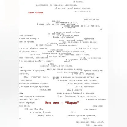 Что такое подростковая любовь? Какая она? И надо ли говорить что-то о ней, если поэты прошедших веков уже, кажется, всё сказали за нас? Сборник "Мне имя Мария" - это своего рода личный дневник девушки, где она делится переживаниями в стихотворной форме. Пытаясь разобраться в своих чувствах, автор ищет ответы в произведениях классиков и не может понять, почему в ее жизни всё не так, как писали в книгах. Однако она забывает, что её имя Мария - с древнееврейского не только "горькая", "упрямая", но и "желанная", как и вся её любовь. "Мне имя Мария " - это громкое заявление о своей индивидуальности, признание всех своих достоинств и недостатков. " Мне имя Мария" - это про любовь...и в первую очередь к себе.