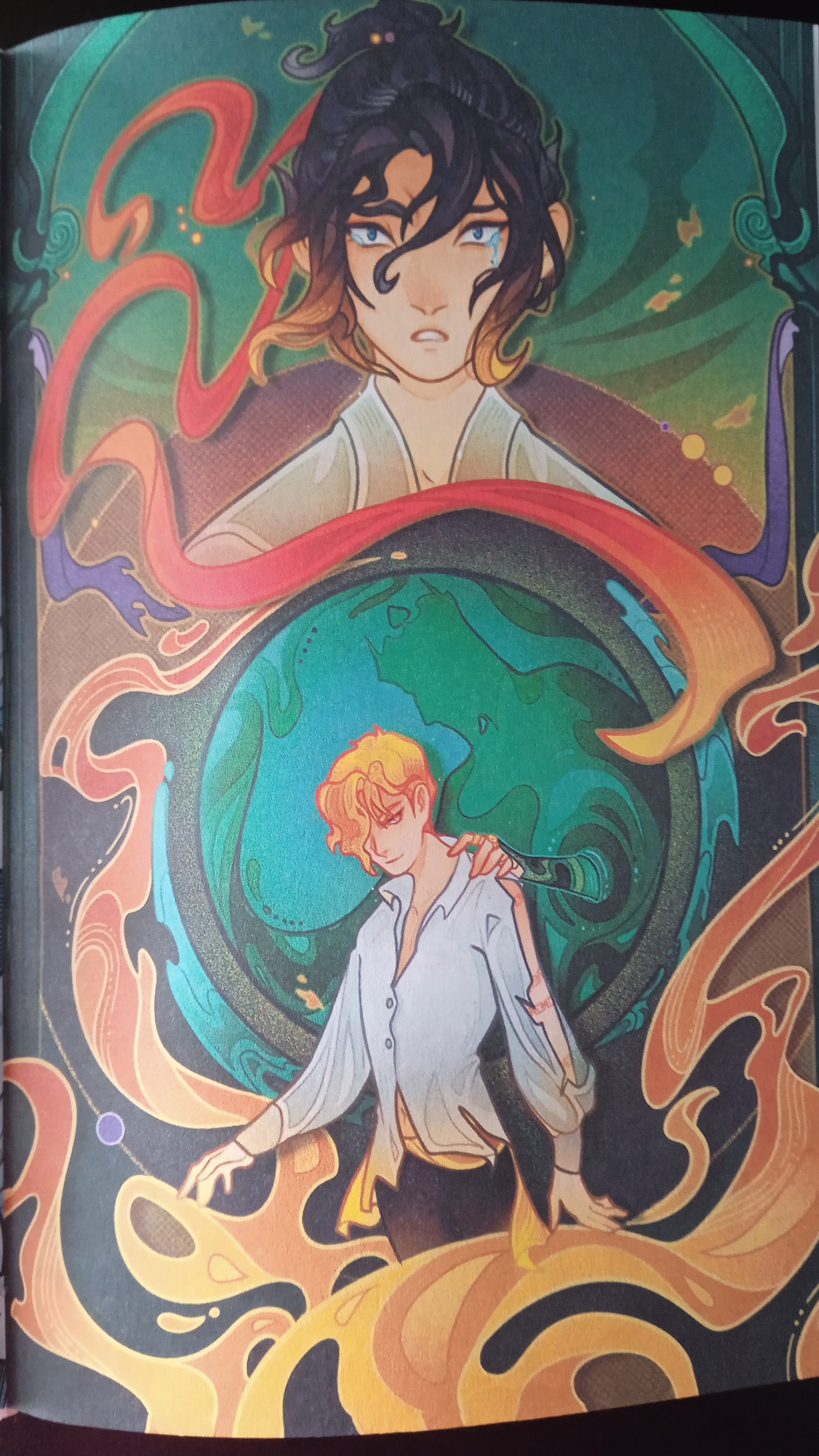 Если говорить о персонажах, то во второй книге старые герои действительно раскрывается намного лучше и приятно (или порой не совсем приятно) удивляют. Все персонажи растут, но при этом остаются собой. Тот же Кристофер во второй книге был временами таким же неуверенным, но стал более решительным мальчиком. А к концу книги, я думаю...он сильно вырос. Пережитое приключение изменило его. Совсем новые герои, например пираты, не оставили равнодушными от слова совсем. Каждый из них имел уникальный характер и смог в той или иной мере запомнится и покорить моё сердце даже с учётом того, что в основном лицезреть их мы могли лишь часть книги. Наверное только мне совсем немного не хватило моментов Бильмы и Атоса, а в особенности Альберто. В то же время такие новые персонажи, как харизматичный (я просто влюбилась) и многосторонний (он заставил меня немного страдать) Гервин и может быть лишь немного надоедливая, но солнечная и чудесная Катарина, были очень хорошо раскрыты как через рассказы о прошлом, так и через поступки и взаимодействия с другими героями. Кстати о взаимодействиях. В книге их было очень много, и они были чудесными. Тёплые отношение между Гилбертом, Мартой и Крисом. Взаимодействия "леди и рыцаря" между Мелайорой и Кристофером, которые ко второй части книги переросли в нечто более...я бы сказала крутое, потому что если скажу иначе, будет мини-спойлер. Дружеско-вражеские отношения между Саймоном и Кристофером, что как были, так и остались...просто...сложными. Настолько, что порой кое-кого хочется стукнуть. Помимо прочего совершенно новые взаимодействия, например Кристофера и Катарины, которые вышли как юмористические, так и очень местами тёплые. Или же, неожиданно, раскрытие отношений Марты и Адриана. И это лишь часть показанных в книге взаимодействий.