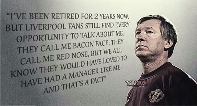 Для меня сэр Алекс Фергюсон - Легенда, Личность межпланетного масштаба и силы, Кумир. Единственный кумир в моей жизни - другого не будет.Он и его команда влюбили меня в футбол, показали мне, что такое упорство, сила, смелость, умение принимать поражения и превращать их в основу будущих побед. Научили меня не опускать руки и верить в себя. Показали мне, что такое традиции и преемственность поколений, и научили меня ценить такие редкие в наш век вещи.