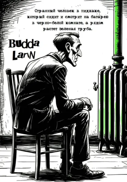 Основной контент книги Странный человек в пиджаке, который сидит и смотрит на батарею в черно-белой комнате, а рядом растет зеленая труба.