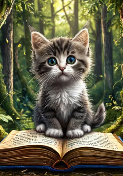 Участвовать в бонусной программеСеро-белый котенок с большим выразительными глазами, волшебная книга, лес, книга создана с помощью нейросети CharGPT.