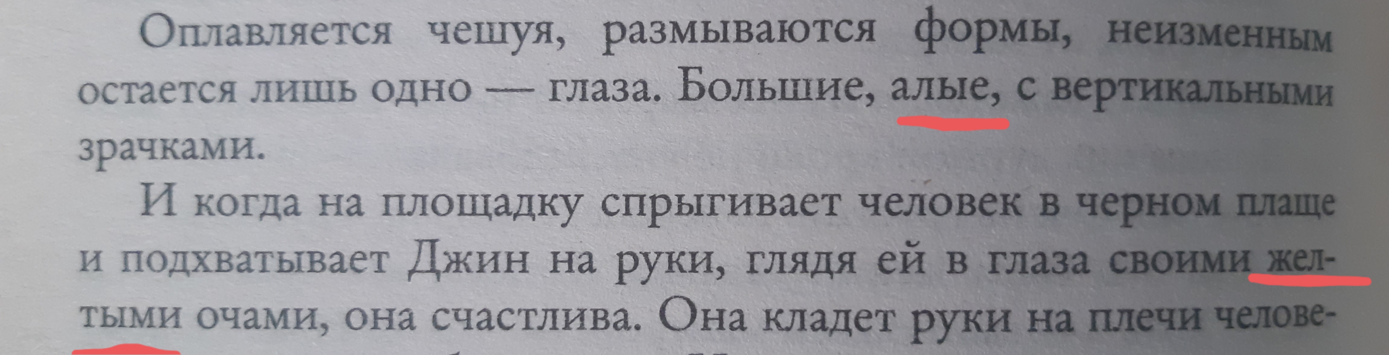 Любовная линия тоже "замечательная", как и главная героиня. Потому что она встречает того самого "защитника" ещё 2 раза, итого 3 кратковременные встречи, при этом он весь такой загадочный - лицо под темным капюшоном не видно, руки в перчатках (при этом героиня умудряется рассмотреть тонкие, аристократические пальцы и делает вывод, что это руки молодого человека, ну ок, видно у неё сканер вместо глаз, ну или автор почему-то забыла, что её главный герой перчатки ни разу не снимал), иногда красные или желтые (фото ниже, автор не определилась) искры на месте глаз (но её это не смущает, не пугает и не заставляет задуматься, что может он какой-нибудь монстр) и всё... она влюблена. Не нужен ей уже даже тот жених, к которому она приехала в замок знакомиться с его семьей. При этом они вроде как друзья, нормально раньше общались, а теперь всё, побоку его.