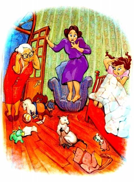Мама потянула за верхнюю лямку, как вдруг откуда-то из глубин выскочила огромная серая крыса! Мама взвизгнула и забралась с ногами на кресло. Прибежала бабушка, застёгивая халат, протирая на ходу очки.