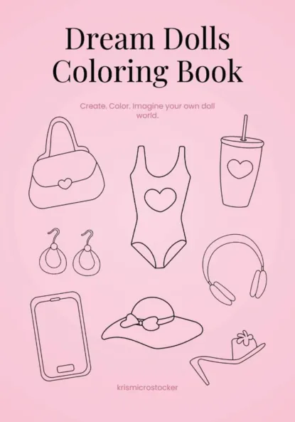 This collection includes 40 line art illustrations inspired by the world of dolls and fashion — bags, dresses, roller skates, coffee cups, phones, hats, rings, and more.