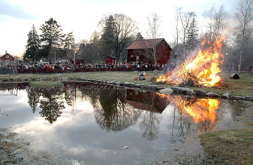 А вот огромный костер в честь дня Святого Вальборга! В этот день взрослые и дети собирают в лесу шишки, прутики и хворост и приносят на специальное место, где вскоре будет пылать огонь. Таких костров в деревне может быть несколько и конечно ребятишки хотят, чтобы именно их костер был самый большой. :)