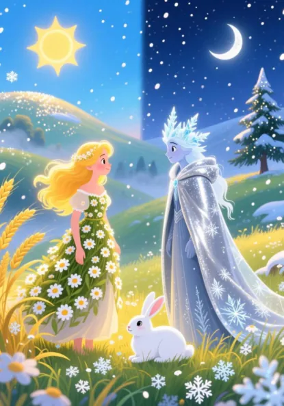 Добрая сказка о том, как Лето решило навестить Зиму, думая, что та скучает. Но в зимнем царстве оно увидело радость, игры и уют. Сёстры поняли, как сильно они нужны друг другу, но мудрая Снежная Сова напомнила: быть вместе им нельзя — природа не выдержит. С тех пор они тайком навещают друг друга всего на миг: Лето — в виде тёплого лучика зимой, а Зима — в виде утреннего инея летом.