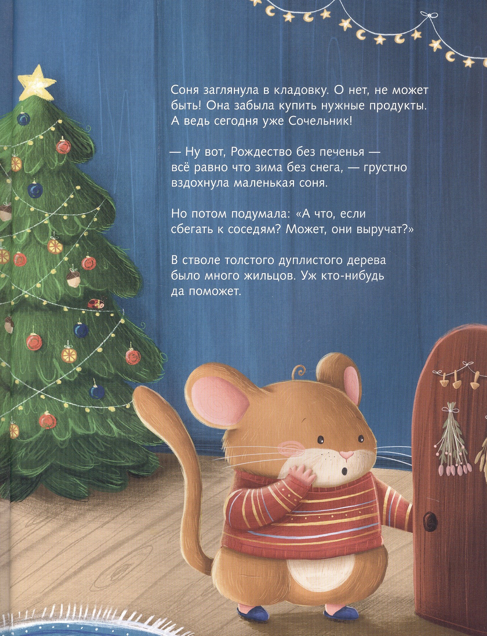 Приближалось Рождество. Орешниковая соня по имени Соня Орешкина вовсю готовилась к празднику. Она только что закончила уборку и собиралась испечь своё любимое печенье, но оказалось, что в её кладовой нет нужных продуктов. «А что, если сбегать к соседям?» – подумала маленькая соня. – Может, они выручат?»
