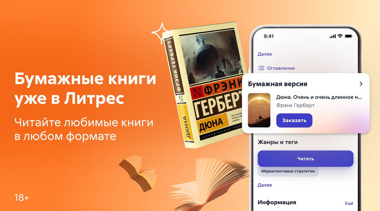 Любители мультиформатного чтения, ликуйте! Теперь в Литрес можно приобрести бумажные книги каталога сети «Читай-город – Буквоед». Это удобно: прочитали/прослушали электронные или аудиокниги, захотели расширить домашнюю библиотеку – не нужно никуда переходить. Оформите заказ прямо в Литрес (на сайте или в приложениях Android и iOS).