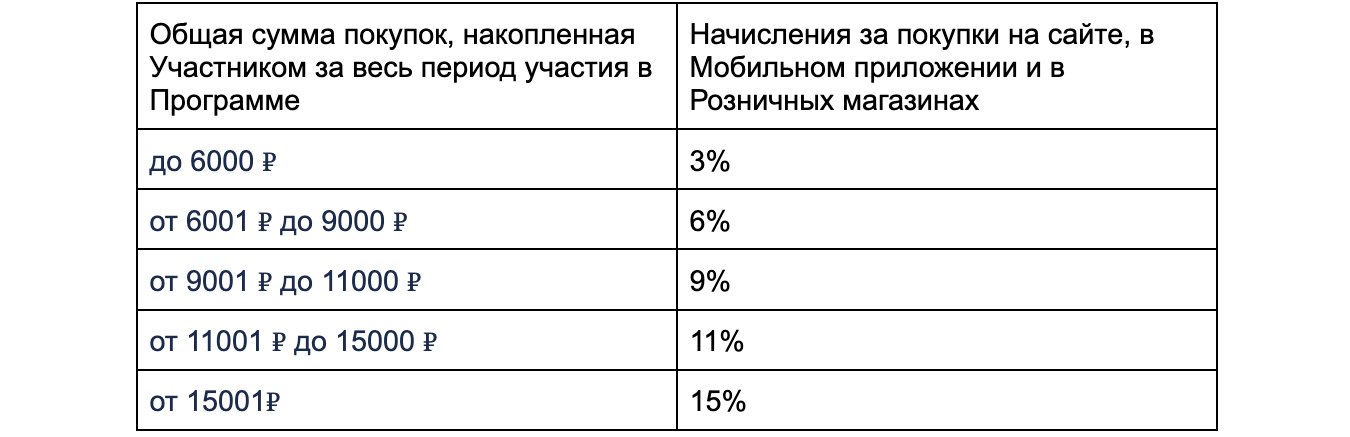 4.4. Бонусы начисляются в зависимости от общей суммы покупок, накопленной Участником Программы за весь период участия в Программе, и суммы чека за покупку. При расчете суммы Бонусов не учитывается стоимость доставки. Бонусы начисляются в следующем размере, согласно действующему процентному уровню Участника Программы: