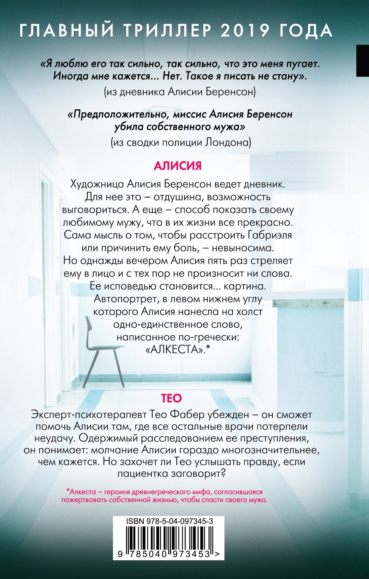 Эксперт-психотерапевт Тео Фабер убежден — он сможет помочь Алисии там, где все остальные врачи потерпели неудачу. Одержимый расследованием ее преступления, он понимает: молчание Алисии гораздо многозначительнее, чем кажется. Но захочет ли Тео услышать правду, если пациентка заговорит?