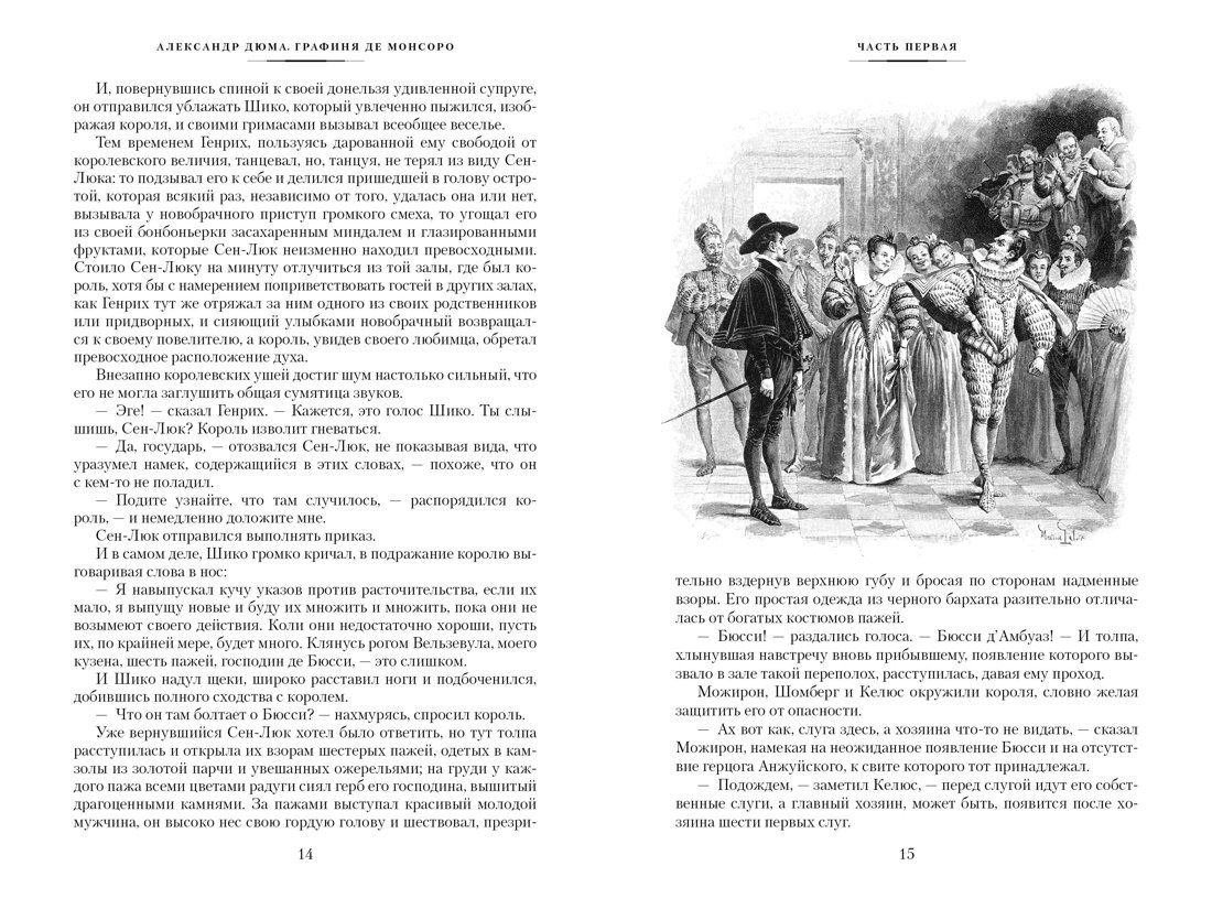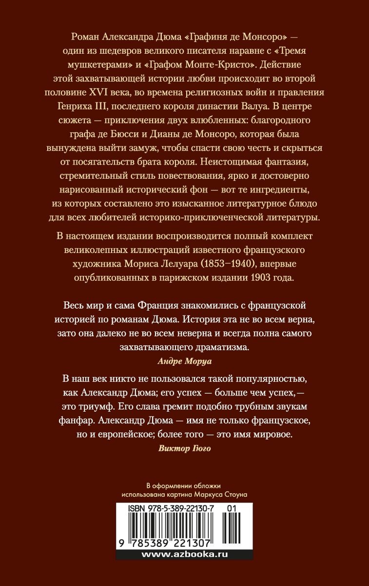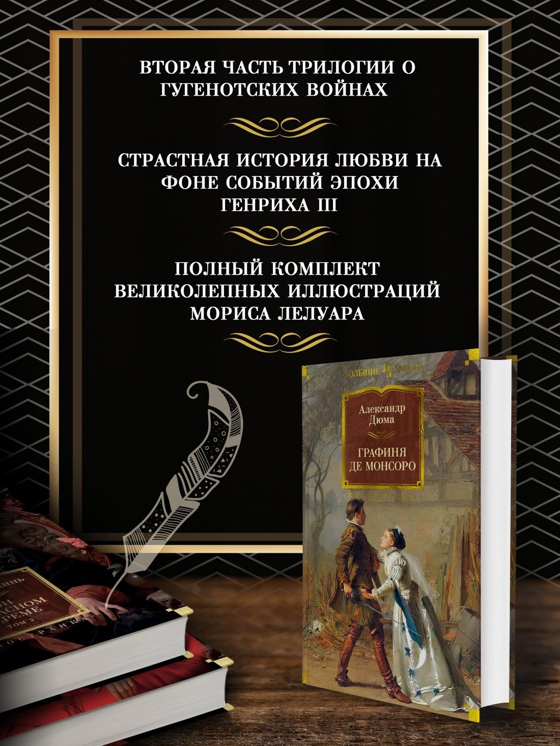 Роман Александра Дюма «Графиня де Монсоро» — один из шедевров великого писателя наравне с «Тремя мушкетерами» и «Графом Монте-Кристо». Действие этой захватывающей истории любви происходит во второй половине XVI века, во времена религиозных войн и правления Генриха III, последнего короля династии Валуа. В центре сюжета — приключения двух влюбленных: благородного графа де Бюсси и Дианы де Монсоро, которая была вынуждена выйти замуж, чтобы спасти свою честь и скрыться от посягательств брата короля. Неистощимая фантазия, стремительный стиль повествования, ярко и достоверно нарисованный исторический фон — вот те ингредиенты, из которых составлено это изысканное литературное блюдо для всех любителей историко-приключенческой литературы. В настоящем издании воспроизводится полный комплект великолепных иллюстраций известного французского художника Мориса Лелуара (1853–1940), впервые опубликованных в парижском издании 1903 года.