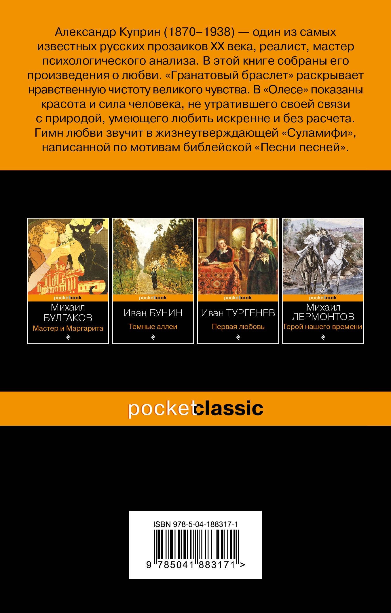 Александр Куприн (1870 —1938) — один из самых известных русских прозаиков ХХ века, реалист, мастер психологического анализа. В этой книге собраны его произведения о любви. «Гранатовый браслет» раскрывает нравственную чистоту великого чувства. В «Олесе» показаны красота и сила человека, не утратившего своей связи с природой, умеющего любить искренне и без расчета. Гимн любви звучит в жизнеутверждающей «Суламифи», написанной по мотивам библейской «Песни песней».