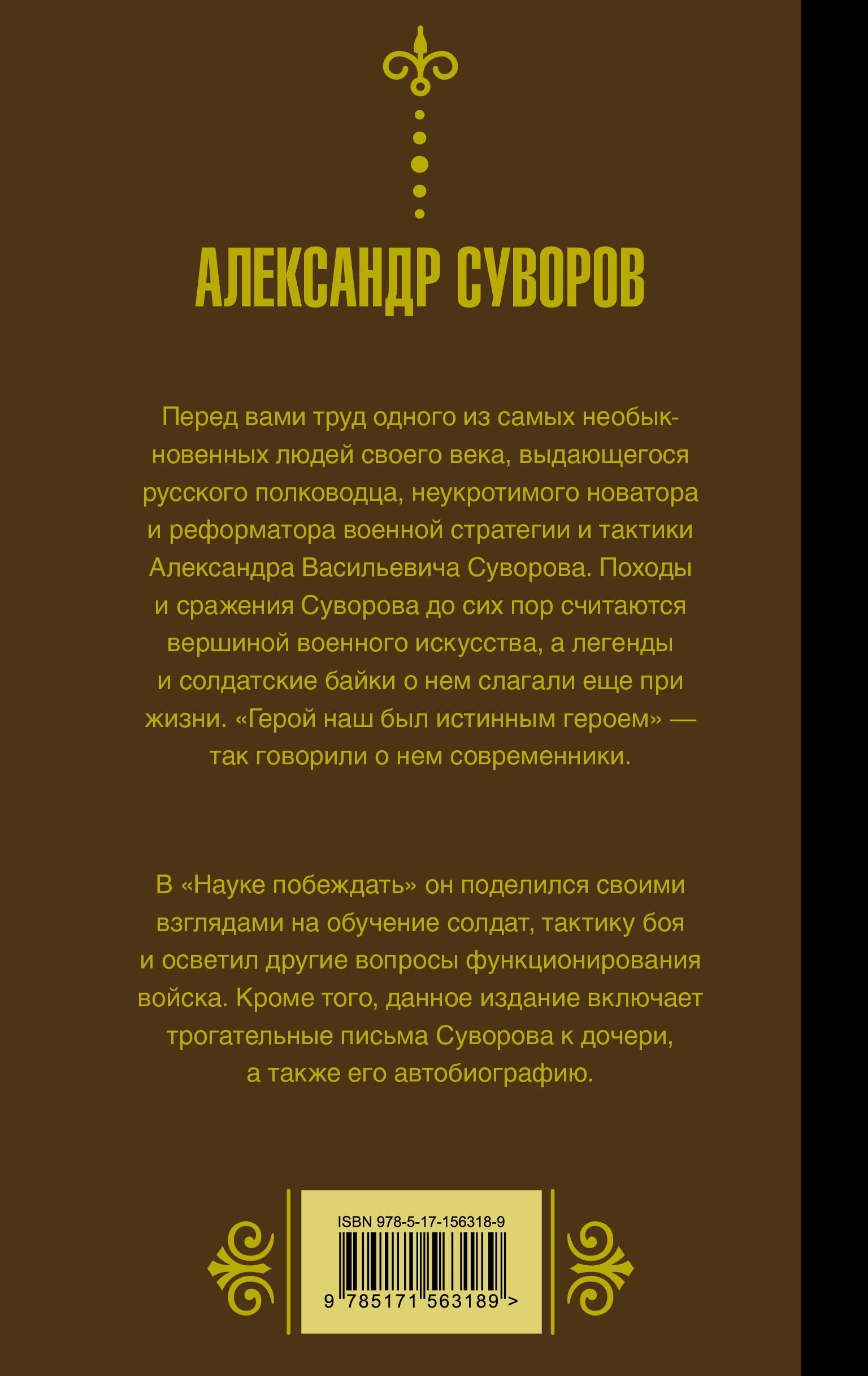 В "Науке побеждать" он поделился своими взглядами на обучение солдат, тактику боя и осветил другие вопросы функционирования войска. Кроме того, данное издание включает в себя трогательные письма Суворова к своей дочери, а также его автобиографию.