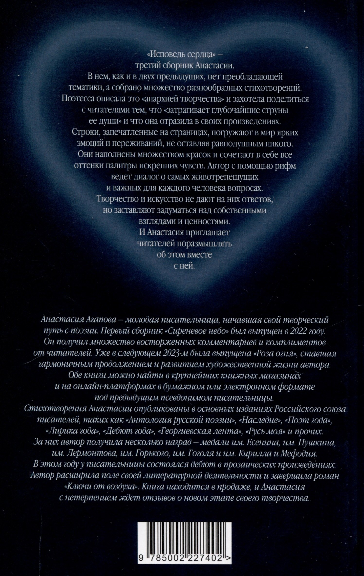 "Исповедь сердца" - третий сборник Анастасии. В нем, как и в двух предыдущих, нет преобладающей тематики, а собрано множество разнообразных стихотворений. Поэтесса описала это "анархией творчества" и захотела поделиться с читателями тем, что "затрагивает глубочайшие струны ее души" и что она отразила в своих произведениях. Строки, запечатленные на страницах, погружают в мир ярких эмоций и переживаний, не оставляя равнодушным никого. Они наполнены множеством красок и сочетают в себе все оттенки палитры искренних чувств. Автор с помощью рифм ведет диалог о самых животрепещущих и важных для каждого человека вопросах. Творчество и искусство не дают на них ответов, но заставляют задуматься над собственными взглядами и ценностями. И Анастасия приглашает читателей поразмышлять об этом вместе с ней.