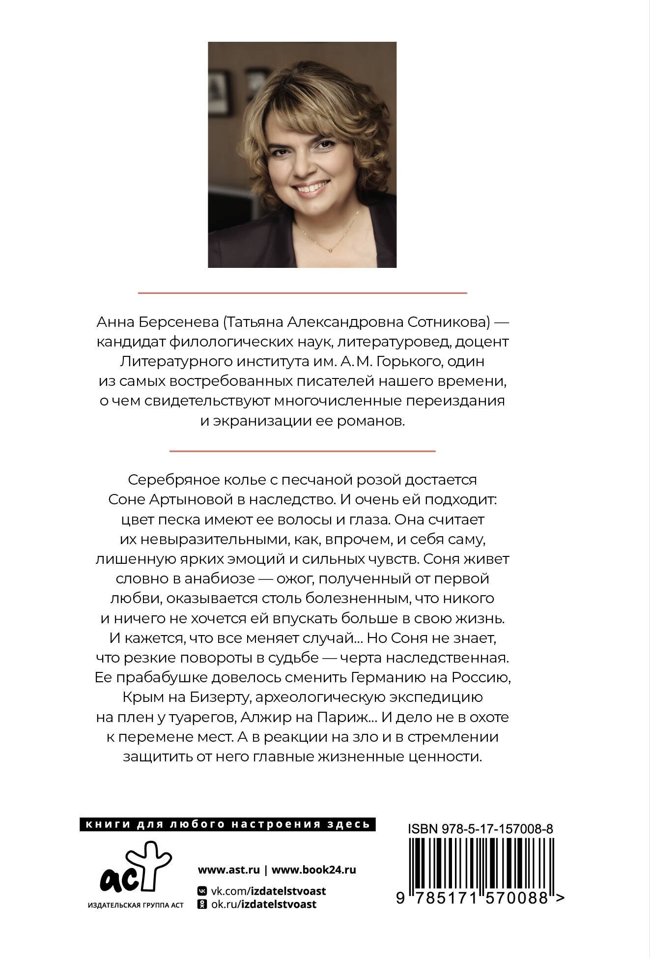 Серебряное колье с песчаной розой достается Соне Артыновой в наследство. И очень ей подходит: цвет песка имеют ее волосы и глаза. Она считает их невыразительными, как, впрочем, и себя саму, лишенную ярких эмоций и сильных чувств. Соня живет словно в анабиозе – ожог, полученный от первой любви, оказывается столь болезненным, что никого и ничего не хочется ей впускать больше в свою жизнь. И кажется, что все меняет случай… Но Соня не знает, что резкие повороты в судьбе – черта наследственная. Ее прабабушке довелось сменить Германию на Россию, Крым на Бизерту, археологическую экспедицию на плен у туарегов, Алжир на Париж… И дело не в охоте к перемене мест. А в реакции на зло и в стремлении защитить от него главные жизненные ценности.