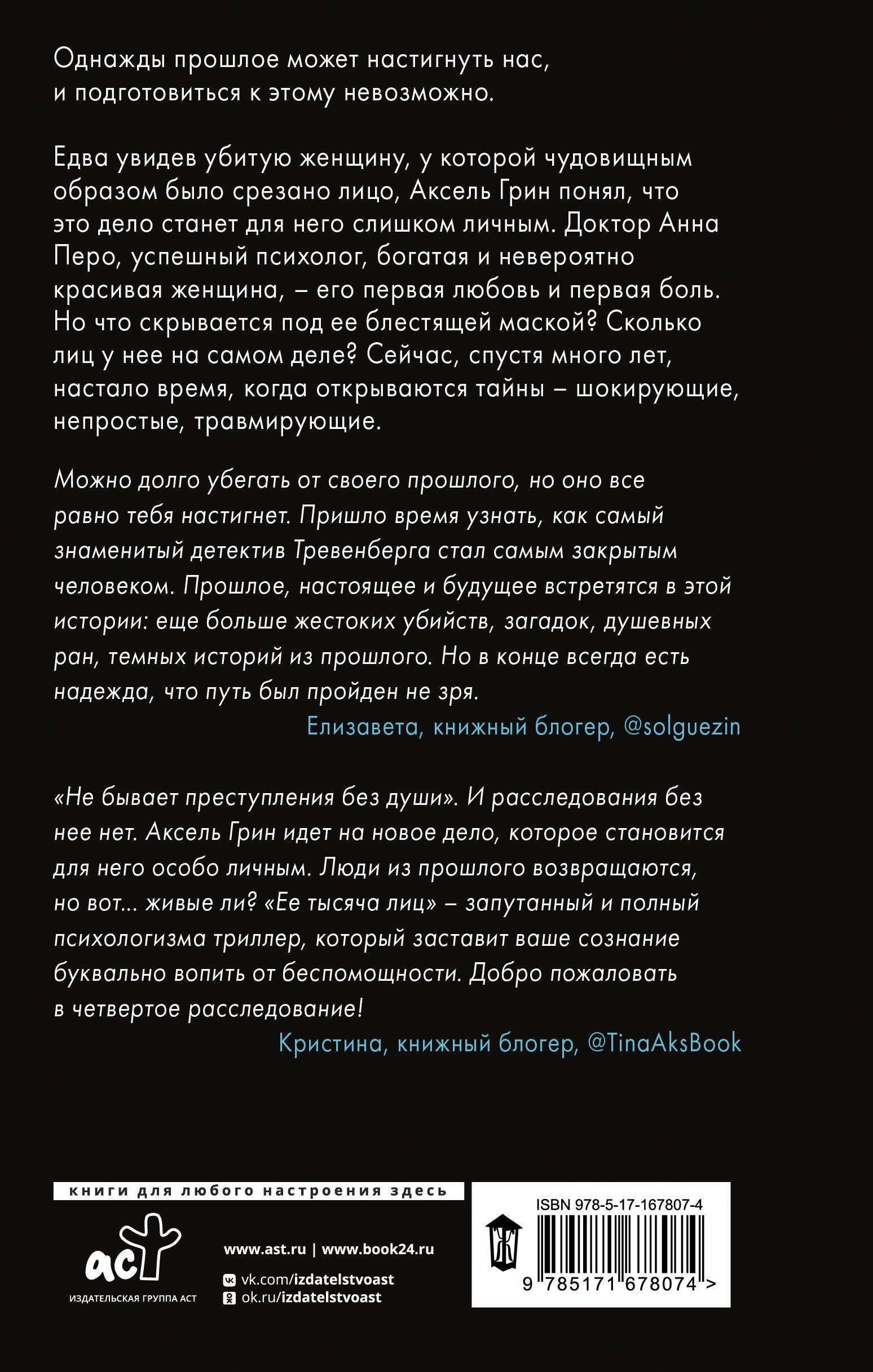 Однажды прошлое может настигнуть нас, и подготовиться к этому невозможно. Едва увидев убитую женщину, у которой чудовищным образом было срезано лицо, Аксель Грин понял, что это дело станет для него слишком личным. Доктор Анна Перо – успешный психолог, богатая и невероятно красивая женщина – его первая любовь и первая боль. Но что скрывается под ее блестящей маской? Сколько лиц у нее на самом деле? Сейчас, спустя много лет, настало время, когда открываются тайны – шокирующие, непростые, травмирующие.