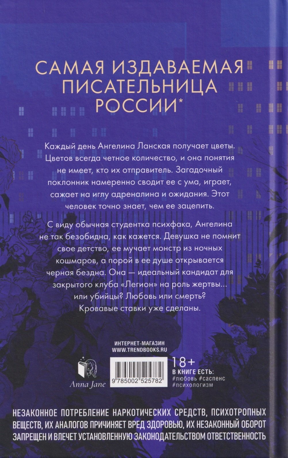 С виду обычная студентка психфака, Ангелина не так безобидна, как кажется. Девушка не помнит свое детство, ее мучает монстр из ночных кошмаров, а порой в ее душе открывается черная бездна. Она — идеальный кандидат для закрытого клуба «Легион» на роль жертвы… или убийцы? Любовь или смерть? Кровавые ставки уже сделаны.