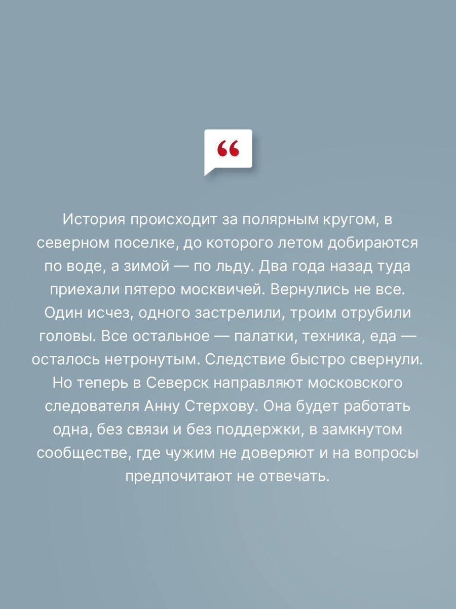 Анна Стерхова прилетела в командировку в северный поселок золотодобытчиков, чтобы расследовать убийство в тайге охотников-любителей из Москвы. Преступление совершено два года назад, но подвижек в деле нет. Рассматривалась версия, что четверых убил пятый член компании, их приятель Холофидин, но он бесследно исчез…