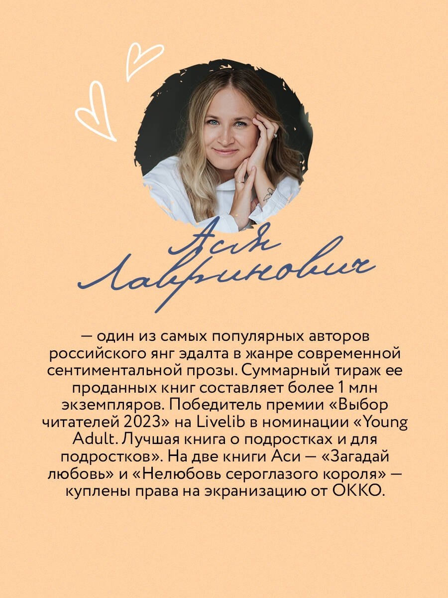 Ася Лавринович — один из самых популярных авторов российского янг эдалта в жанре современной сентиментальной прозы. Суммарный тираж ее проданных книг составляет более 1 млн экземпляров. Победитель премии «Выбор читателей 2023» на Livelib в номинации «Young Adult. Лучшая книга о подростках и для подростков». На две книги Аси — «Загадай любовь» и «Нелюбовь сероглазого короля» — куплены права на экранизацию от ОККО.
