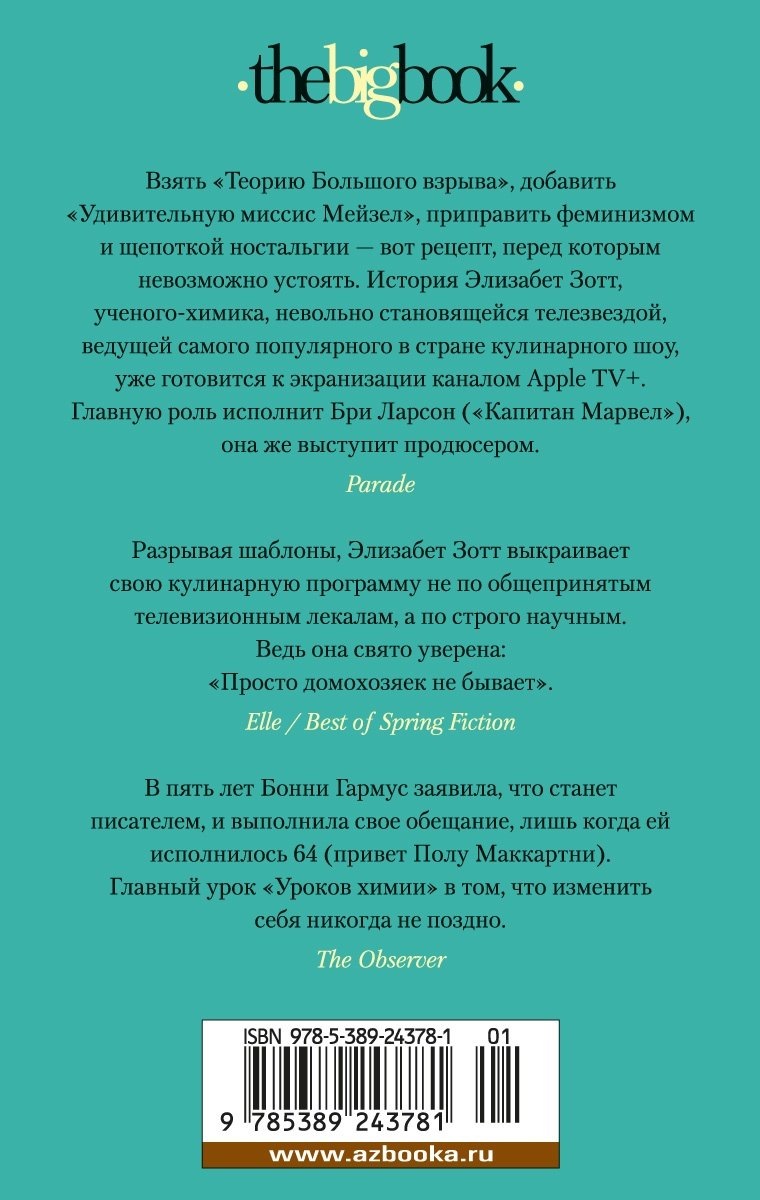 Все боятся Элизабет Зотт. Кто-то — ее ума, кто-то — остро заточенного карандаша, который она носит в прическе, а кто-то — четырнадцатидюймового ножа из ее сумочки (ведь каждый уважающий себя кулинар пользуется только своими собственными ножами). Причудливый зигзаг судьбы привел ее из Научно-исследовательского института Гастингса, где она мечтала заниматься абиогенезом (теорией возникновения жизни из неорганических веществ), на телевидение, где она ведет самую популярную в стране кулинарную передачу «Ужин в шесть». «Кулинария — это химия, — говорит она. — А химия — это жизнь. Она дает нам возможность изменить все, включая себя». Тем временем ее пятилетняя дочь Мадлен, растущая под присмотром минно-разыскного пса по кличке Шесть-Тридцать, пытается найти в школьной библиотеке Набокова и Нормана Мейлера, а также выстроить родословное древо, на котором должно найтись место и без пяти минут нобелевскому лауреату по химии Кальвину Эвансу, и фее-крестной, и деду в полосатой тюремной робе, и бабке, укрывшейся от налоговой полиции в Бразилии....
