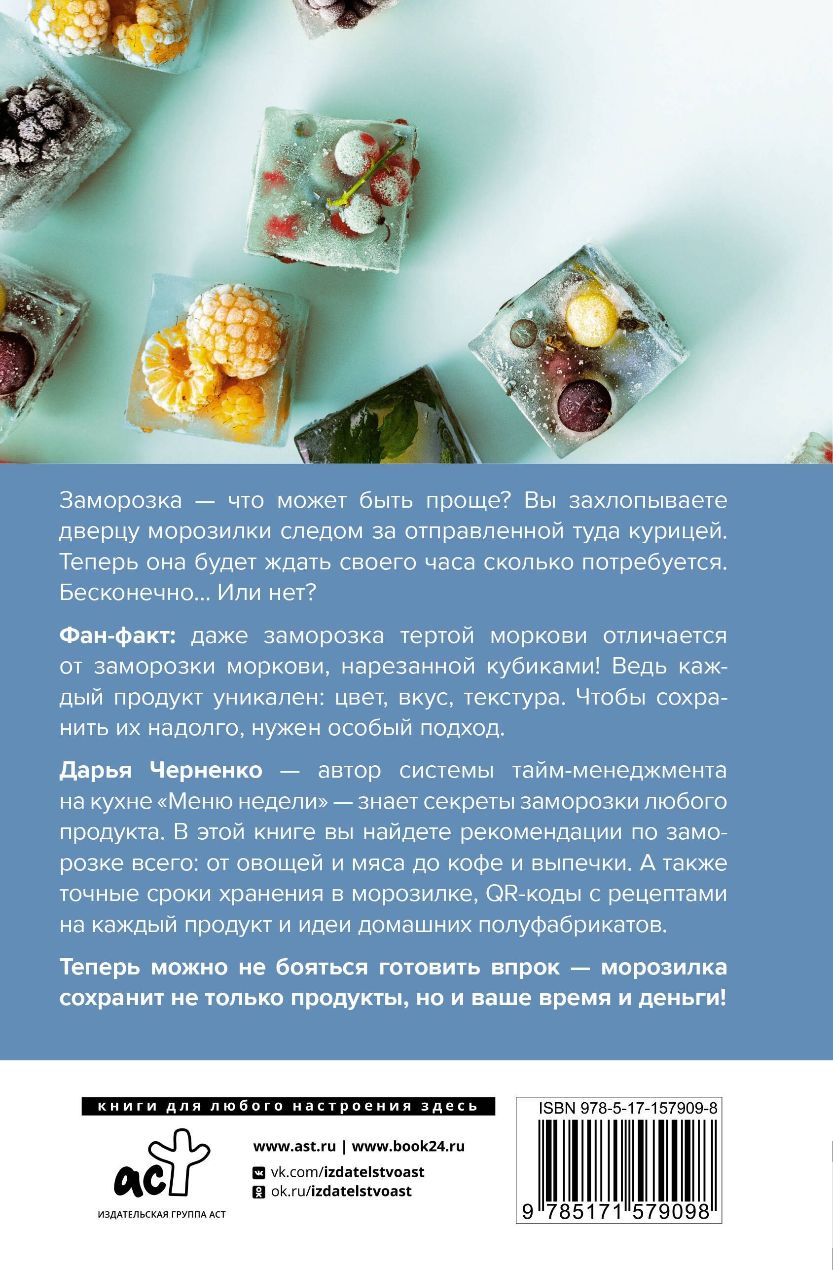 Заморозка — что может быть проще? Вы захлопываете дверцу морозилки следом за отправленной туда курицей. Теперь она будет ждать своего часа сколько потребуется. Бесконечно… Или нет? Фан-факт: даже заморозка тертой моркови отличается от заморозки моркови, нарезанной кубиками! Ведь каждый продукт уникален: цвет, вкус, текстура. Чтобы сохранить их надолго, нужен особый подход. Дарья Черненко — автор системы тайм-менеджмента на кухне "Меню недели" — знает секреты заморозки любого продукта. В этой книге вы найдете рекомендации по заморозке всего: от овощей и мяса до кофе и выпечки. А также точные сроки хранения в морозилке, QR-коды с рецептами на каждый продукт и идеи домашних полуфабрикатов. Теперь можно не бояться готовить впрок — морозилка сохранит не только продукты, но и ваше время и деньги!