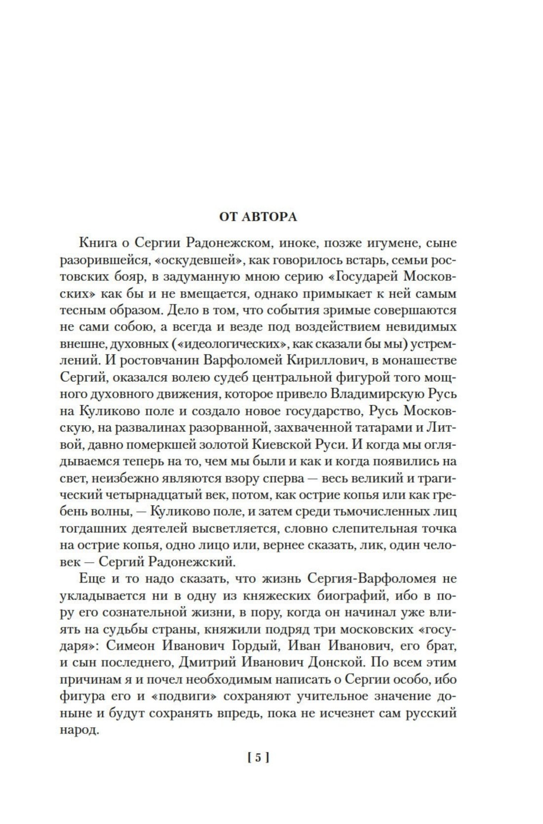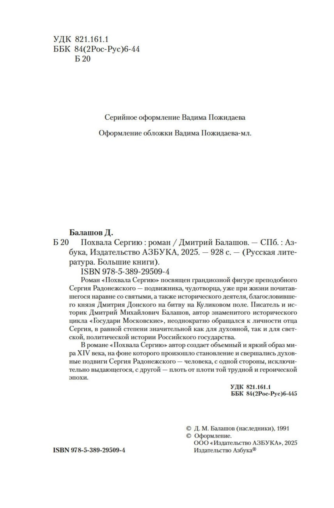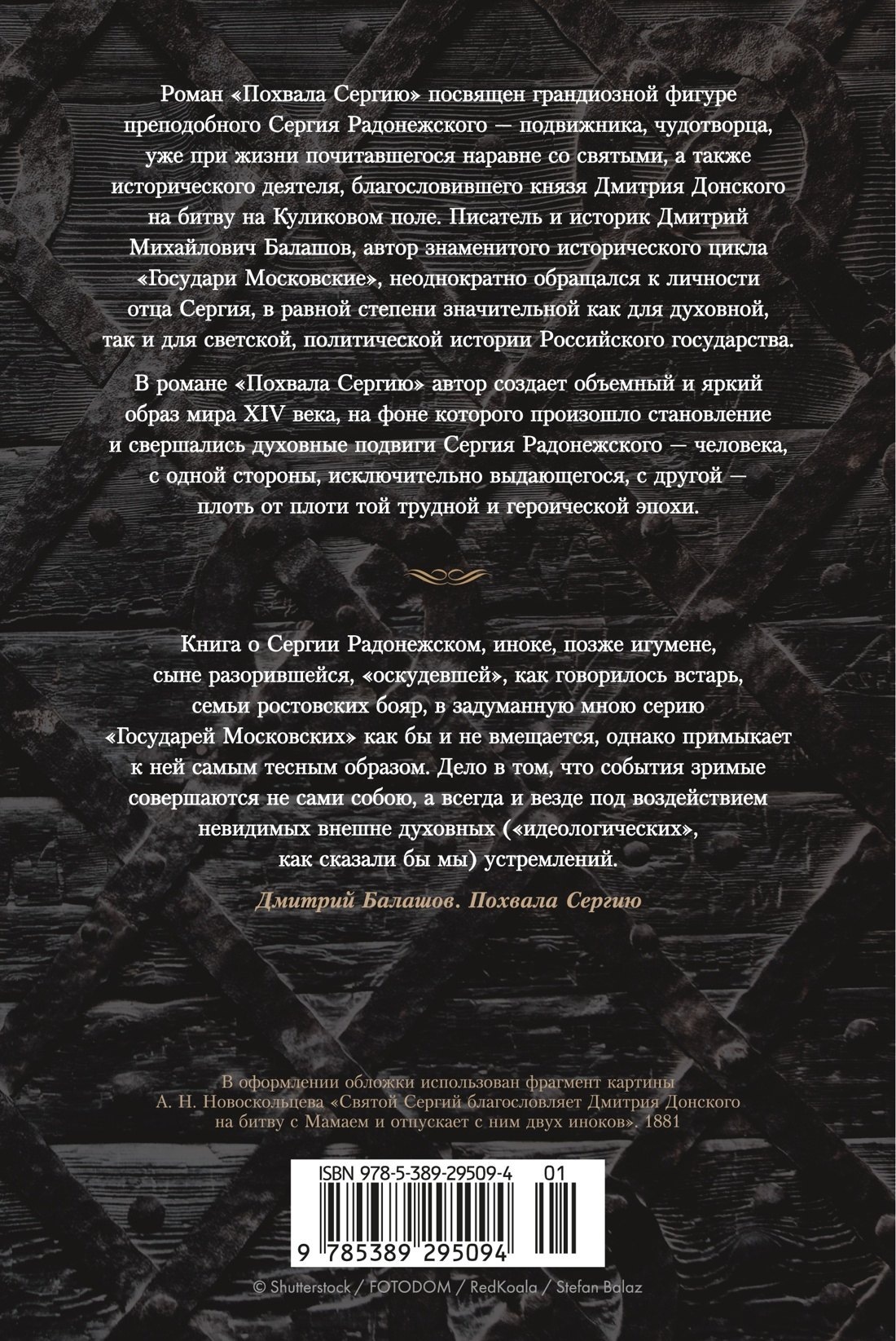 Роман «Похвала Сергию» посвящен грандиозной фигуре преподобного Сергия Радонежского — подвижника, чудотворца, уже при жизни почитавшегося наравне со святыми, а также исторического деятеля, благословившего князя Дмитрия Донского на битву на Куликовом поле. Писатель и историк Дмитрий Михайлович Балашов, автор знаменитого исторического цикла «Государи Московские», неоднократно обращался к личности отца Сергия, в равной степени значительной как для духовной, так и для светской, политической истории Российского государства.
