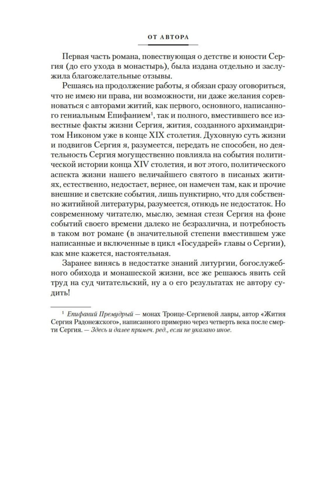 В романе «Похвала Сергию» автор создает объемный и яркий образ мира XIV века, на фоне которого произошло становление и свершались духовные подвиги Сергия Радонежского — человека, с одной стороны, исключительно выдающегося, с другой — плоть от плоти той трудной и героической эпохи.