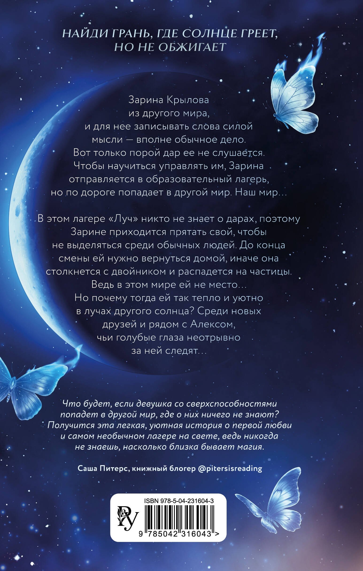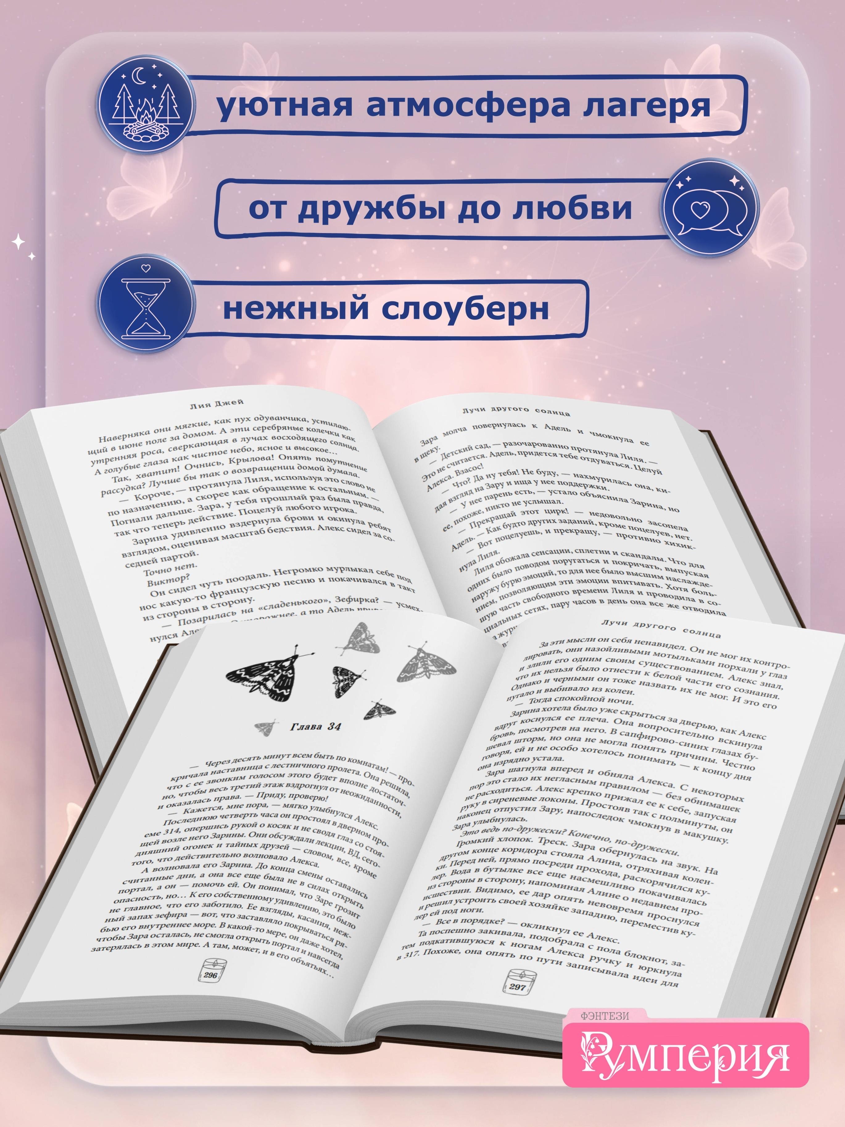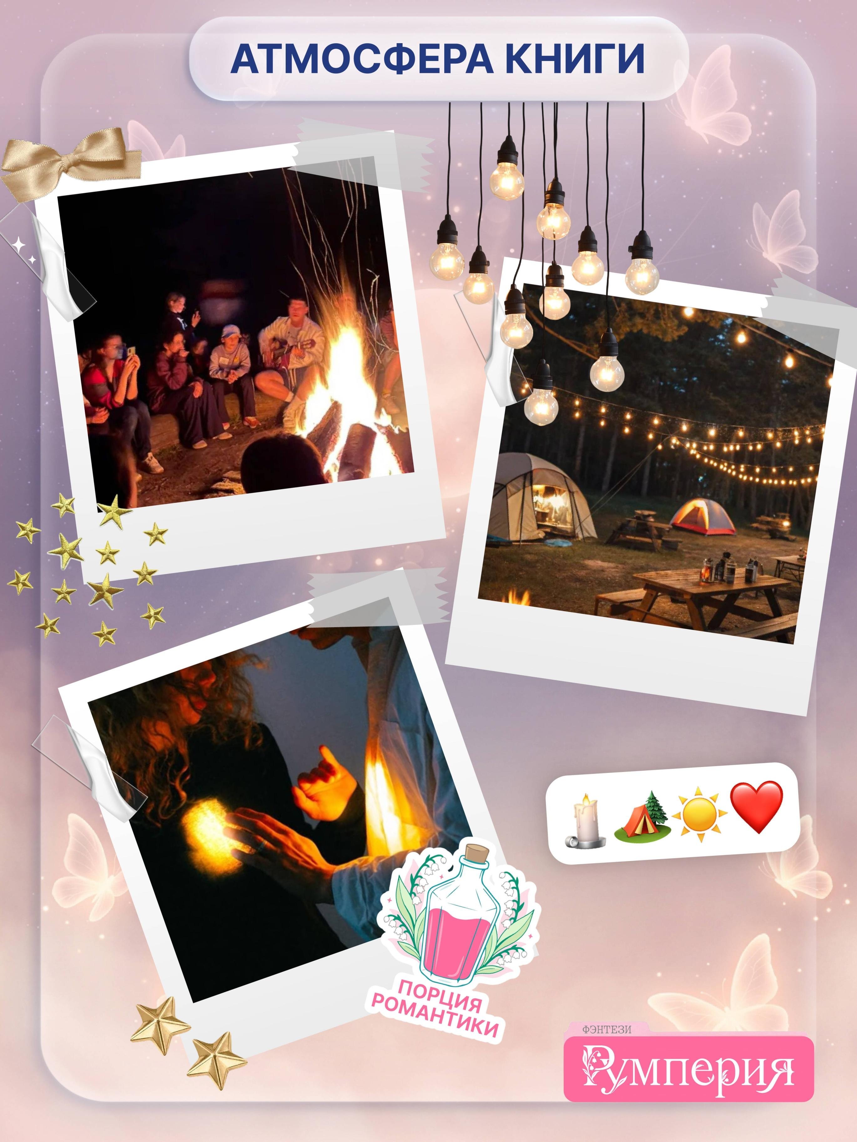 Внутри книги вас ждет: сахарная пленка на обложке, яркий макет, попаданка из магического мира в наш, закрытый образовательный лагерь, слоуберн, от дружбы до любви, российский сеттинг, уютная атмосфера и песни под гитару!