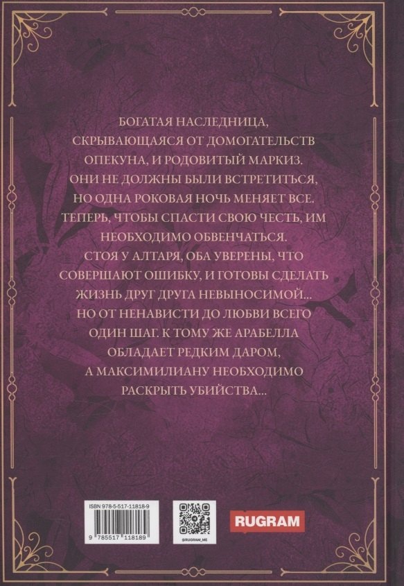 Богатая наследница, скрывающаяся от домогательств опекуна, и родовитый маркиз. Они не должны были встретиться, но одна роковая ночь меняет все. Теперь, чтобы спасти свою честь, им необходимо обвенчаться. Стоя у алтаря, оба уверены, что совершают ошибку, и готовы сделать жизнь друг друга невыносимой… Но от ненависти до любви всего один шаг. К тому же Арабелла обладает редким даром, а Максимилиану необходимо раскрыть убийства…