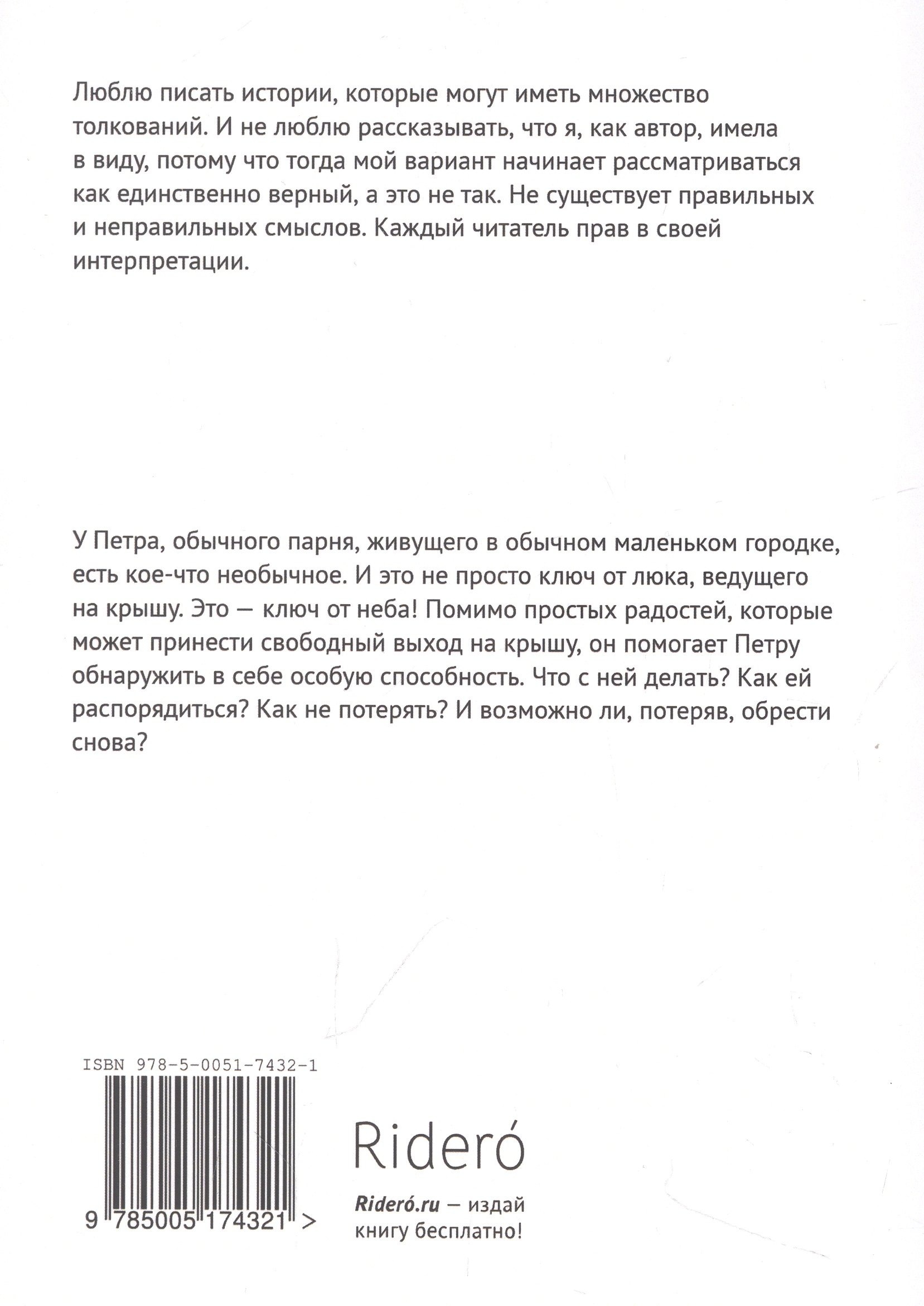 У Петра, обычного парня, живущего в обычном маленьком городке, есть кое-что необычное. И это не просто ключ от люка, ведущего на крышу. Это – ключ от неба! Помимо простых радостей, которые может принести свободный выход на крышу, он помогает Петру обнаружить в себе особую способность. Что с ней делать? Как ей распорядиться? Как не потерять? И возможно ли, потеряв, обрести снова?