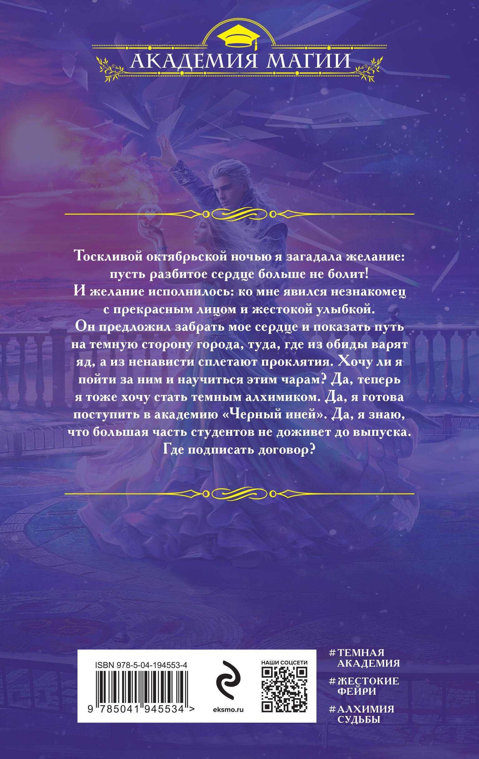 Тоскливой октябрьской ночью я загадала желание: пусть разбитое сердце больше не болит! И желание исполнилось: ко мне явился незнакомец с прекрасным лицом и жестокой улыбкой. Он предложил забрать мое сердце и показать путь на темную сторону города, туда, где из обиды варят яд, а из ненависти сплетают проклятия. Хочу ли я пойти за ним и научиться этим чарам? Да, теперь я тоже хочу стать темным алхимиком. Да, я готова поступить в академию «Черный иней». Да, я знаю, что большая часть студентов не доживет до выпуска. Где подписать договор?