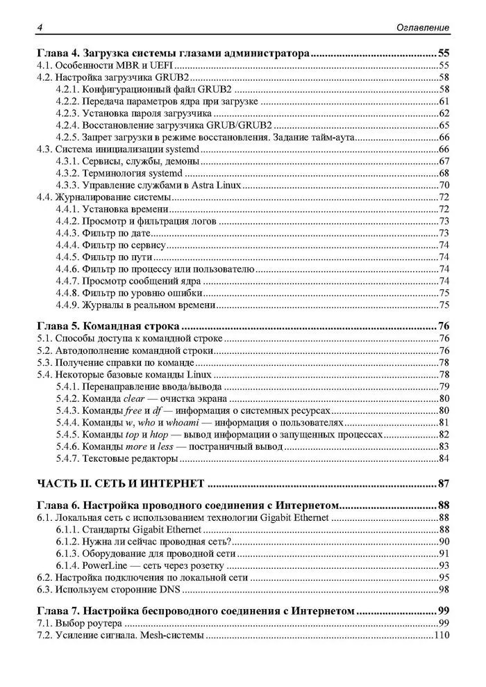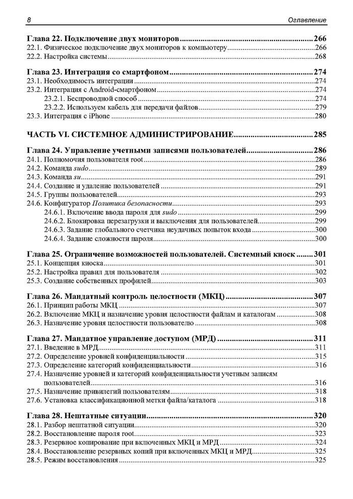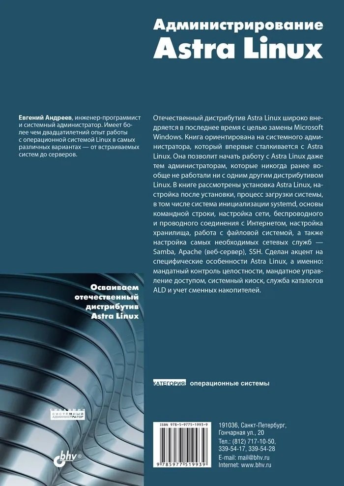 Рассмотрена установка Astra Linux, настройка после установки, процесс загрузки системы, в том числе система инициализации systemd, основы командной строки, настройка сети, беспроводного и проводного соединения с Интернетом, установка ПО, настройка хранилища, работа с файловой системой, настройка Samba (интеграция с Windows-сетью), Apache (веб-сервер), SSH, VNC (графический удаленный доступ) и других необходимых сетевых служб. Сделан акцент на специфические особенности Astra Linux, а именно: мандатный контроль целостности, мандатное управление доступом, системный киоск, служба каталогов ALD и учет сменных накопителей. Книга написана с учетом запросов системных администраторов, которым поставлена задача перейти с Microsoft Windows на популярный отечественный дистрибутив Astra Linux. При этом специально для читателей, никогда ранее не использовавших Linux, рассмотрены основы работы с Linux.