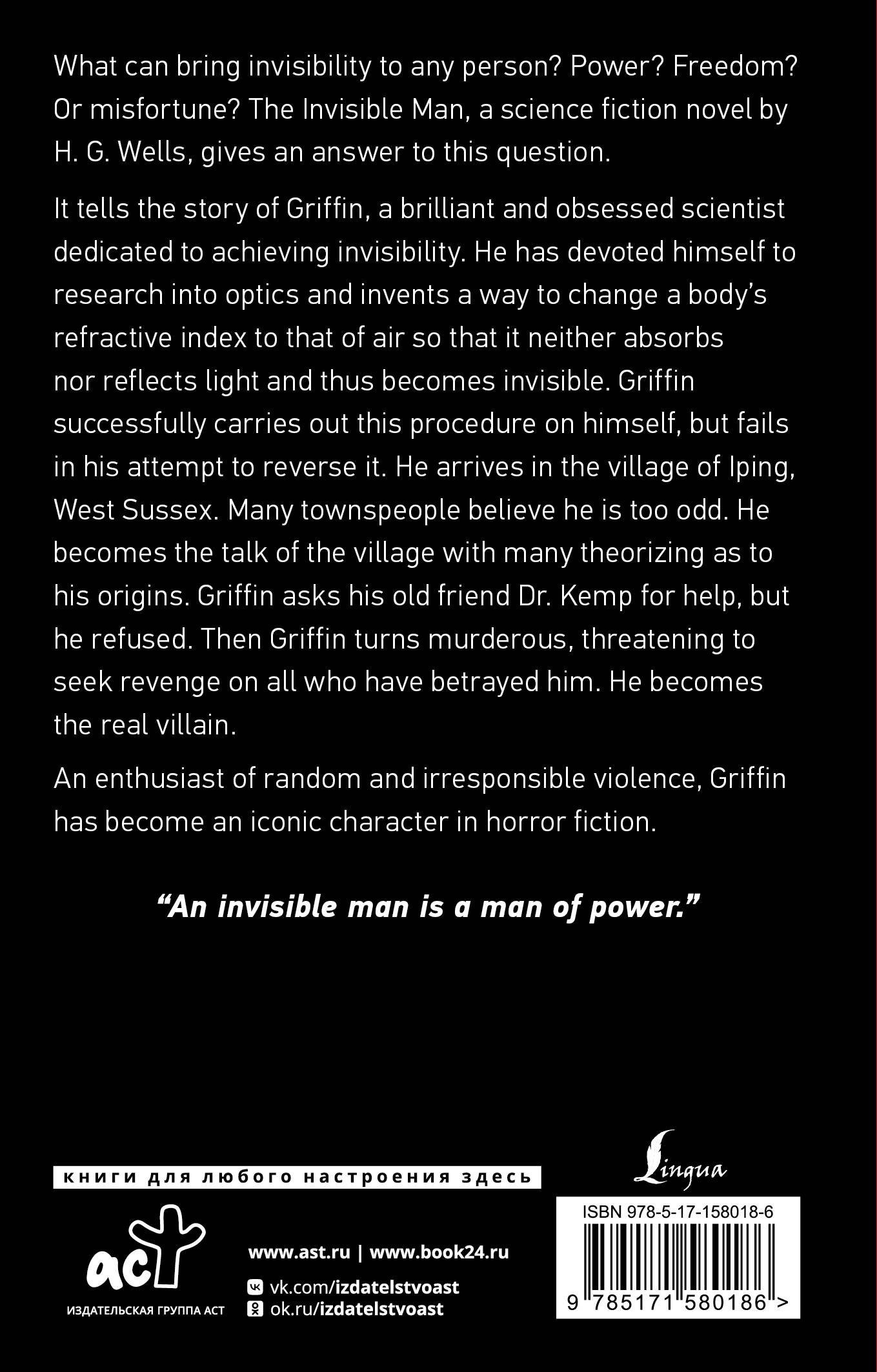Это история о талантливом ученом по имени Гриффин, который смог создать аппарат, делающий людей и не только невидимыми, но это принесло ему лишь несчастье.