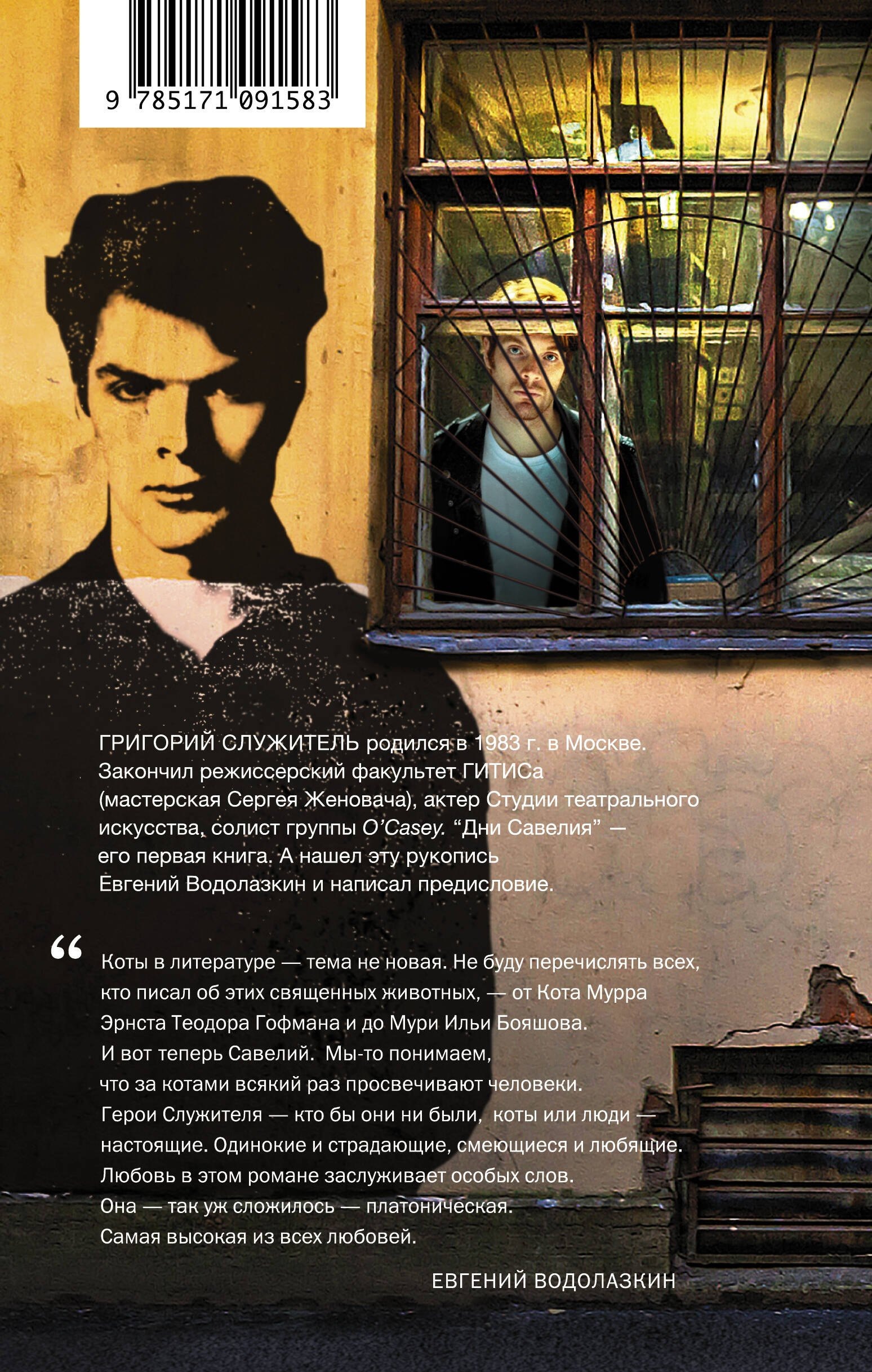 Григорий Служитель родился в 1983 г. в Москве. Окончил режиссерский факультет ГИТИСа (мастерская Сергея Женовача), актер Студии театрального искусства, солист группы O'Casey. «Дни Савелия» — его первая книга, роман вошел в лонг-лист премии «НОС». А нашел эту рукопись Евгений Водолазкин и написал предисловие.