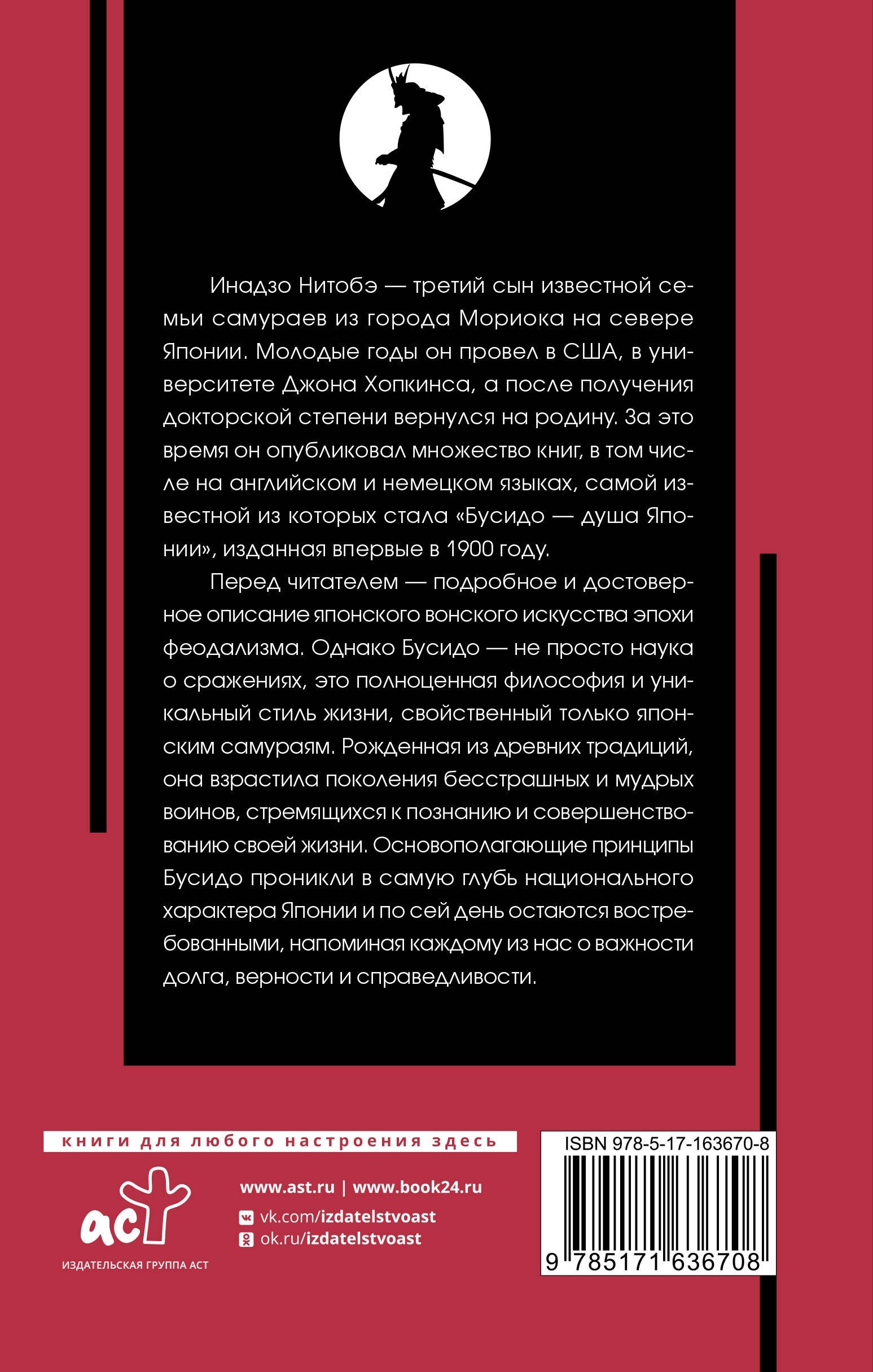 Инадзо Нитобэ — третий сын известной семьи самураев из города Мориока на севере Японии. Молодые годы он провел в США, в университете Джона Хопкинса, а после получения докторской степени вернулся на родину. За это время он опубликовал множество книг, в том числе на английском и немецком языках, самой известной из которых стала "Бусидо — душа Японии", изданная впервые в 1900 году. Перед читателем — подробное и достоверное описание японского вонского искусства эпохи феодализма. Однако Бусидо — не просто наука о сражениях, это полноценная философия и уникальный стиль жизни, свойственный только японским самураям. Рожденная из древних традиций, она взрастила поколения бесстрашных и мудрых воинов, стремящихся к познанию и совершенствованию своей жизни. Основополагающие принципы Бусидо проникли в самую глубь национального характера Японии и по сей день остаются востребованными, напоминая каждому из нас о важности долга, верности и справедливости.