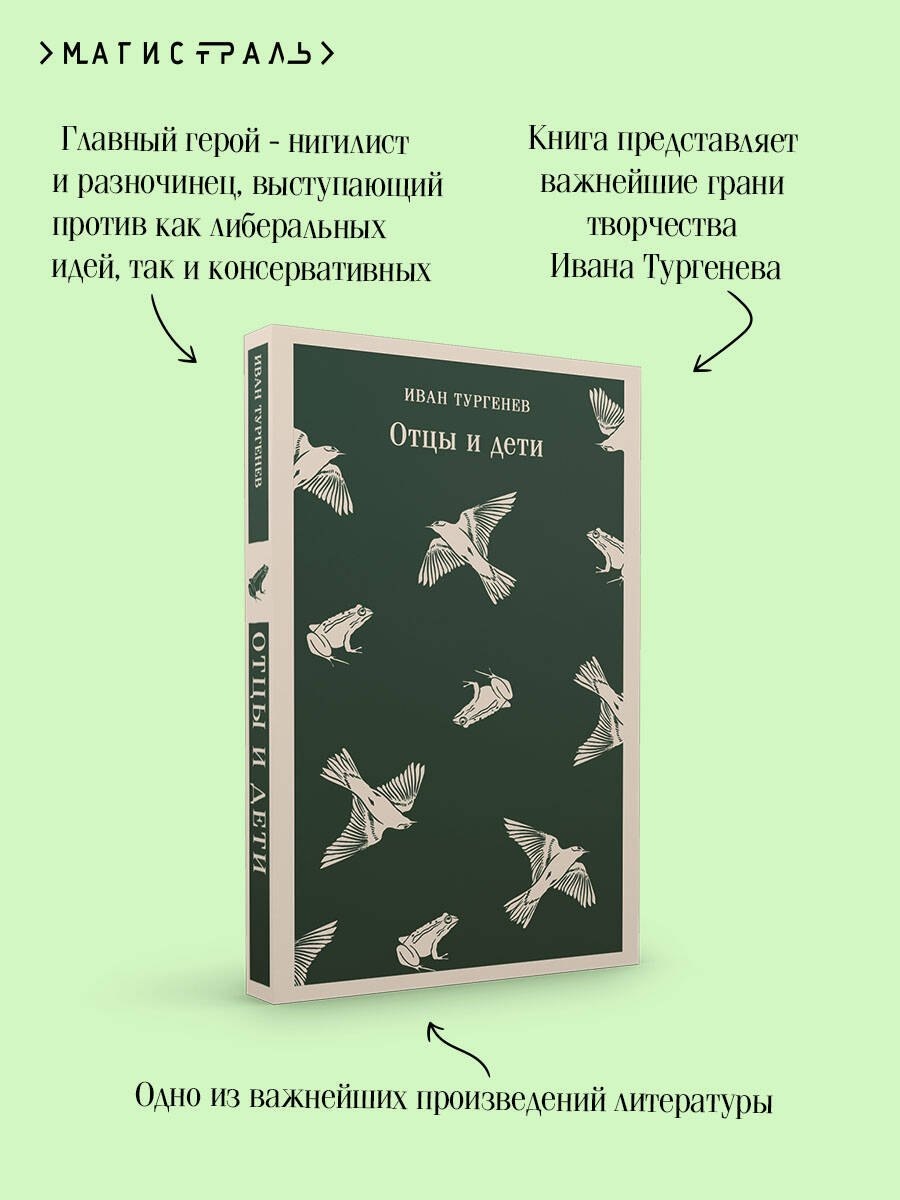 «Вся моя повесть направлена против дворянства как передового класса. Вглядитесь в лица Николая Петровича, Павла Петровича, Аркадия. Слабость и вялость или ограниченность», — так Тургенев разъясняет замысел своего романа. Причем берет он «именно хороших представителей дворянства», показывая: «Если сливки плохи, что же молоко?» Евгений Базаров — главный герой, нигилист и разночинец, выступающий против как либеральных идей, так и консервативных. Бескомпромиссность и приоритет полезного над прекрасным — два главных принципа молодого доктора, ставшего примером для подражания молодежи 1860-х годов. Чужой для всех, Базаров внезапно чувствует в себе то, от чего заведомо отрекся как от бесполезного, — любовь. Но можно ли ему быть рабом своей страсти?