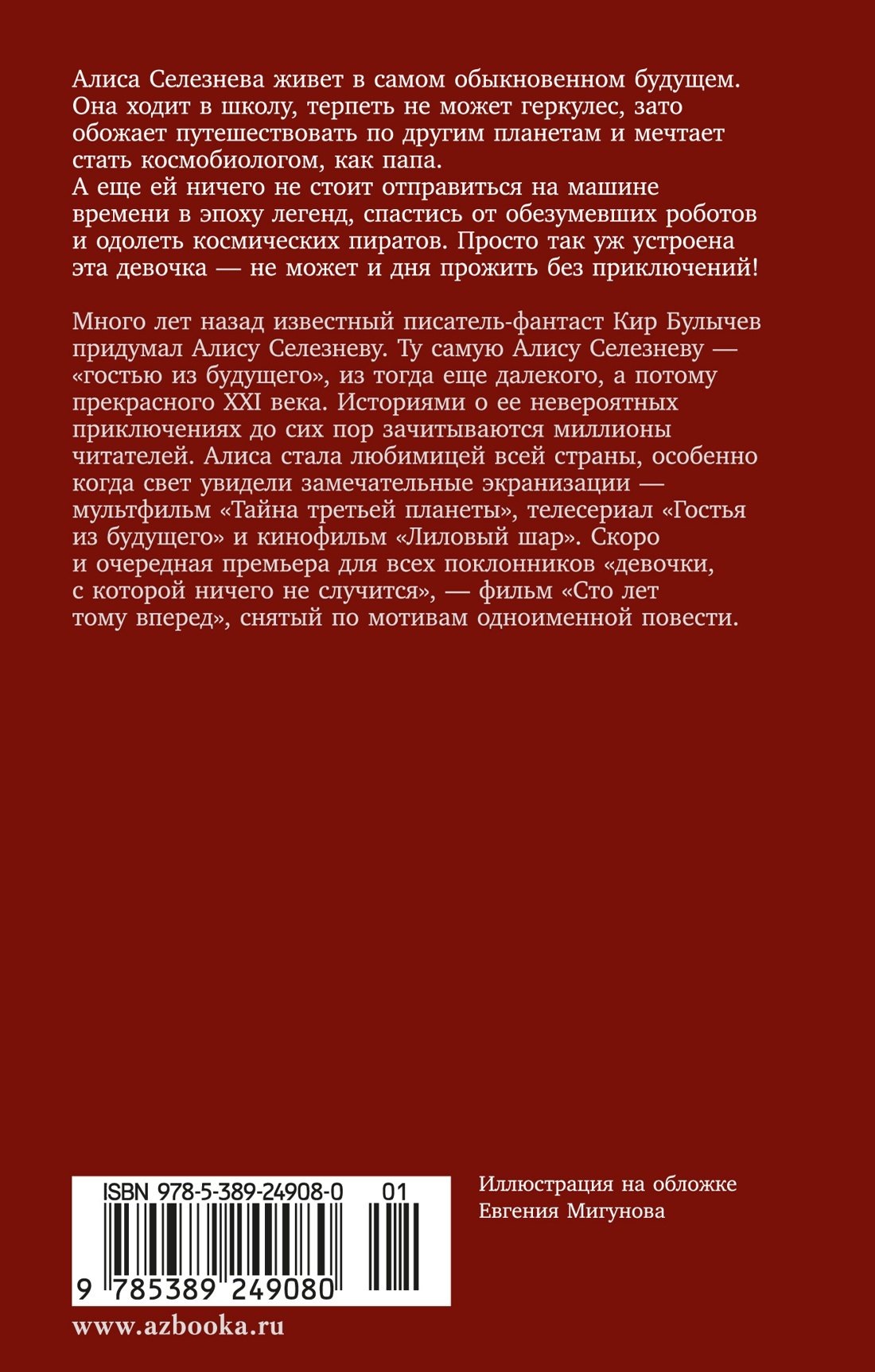 Алиса Селезнёва живет в самом обыкновенном будущем. Она ходит в школу, терпеть не может геркулес, зато обожает путешествовать по другим планетам и мечтает стать космобиологом, как папа. А еще ей ничего не стоит отправиться на машине времени в эпоху легенд, спастись от обезумевших роботов и одолеть космических пиратов. Просто так уж устроена эта девочка — не может и дня прожить без приключений! Много лет назад известный писатель-фантаст Кир Булычев придумал Алису Селезнёву. Ту самую Алису Селезнёву — «гостью из будущего», из тогда еще далекого, а потому прекрасного XXI века. Историями о ее невероятных приключениях до сих пор зачитываются миллионы читателей. Алиса стала любимицей всей страны, особенно когда свет увидели замечательные экранизации — мультфильм «Тайна третьей планеты», телесериал «Гостья из будущего» и кинофильм «Лиловый шар». Скоро и очередная премьера для всех поклонников «девочки, с которой ничего не случится» — фильм «Сто лет тому вперед», снятый по мотивам одноименной повести.