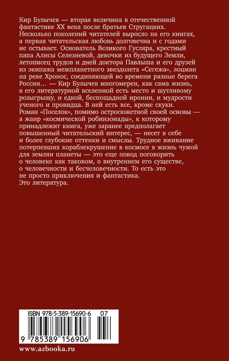 Кир Булычев — вторая величина в отечественной фантастике XX века после братьев Стругацких. Несколько поколений читателей выросло на его книгах, а первая читательская любовь долговечна и с годами не остывает. Основатель Великого Гусляра, крёстный папа Алисы Селезневой, девочки из будущего Земли, летописец трудов и дней доктора Павлыша и его друзей из экипажа межпланетного звездолета «Сегежа», лоцман на реке Хронос, соединяющей во времени разные берега России… — Кир Булычев многомерен, как сама жизнь, в его литературной вселенной есть место и шутливому розыгрышу, и едкой, беспощадной иронии, и мудрости ученого и провидца. В ней есть все, кроме скуки.