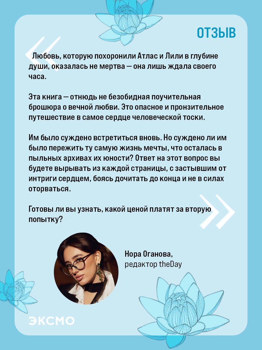 «Любовь, которую похоронили Атлас и Лили в глубине души, оказалась не мертва — она лишь ждала своего часа». — Нора Оганова, редактор theDay