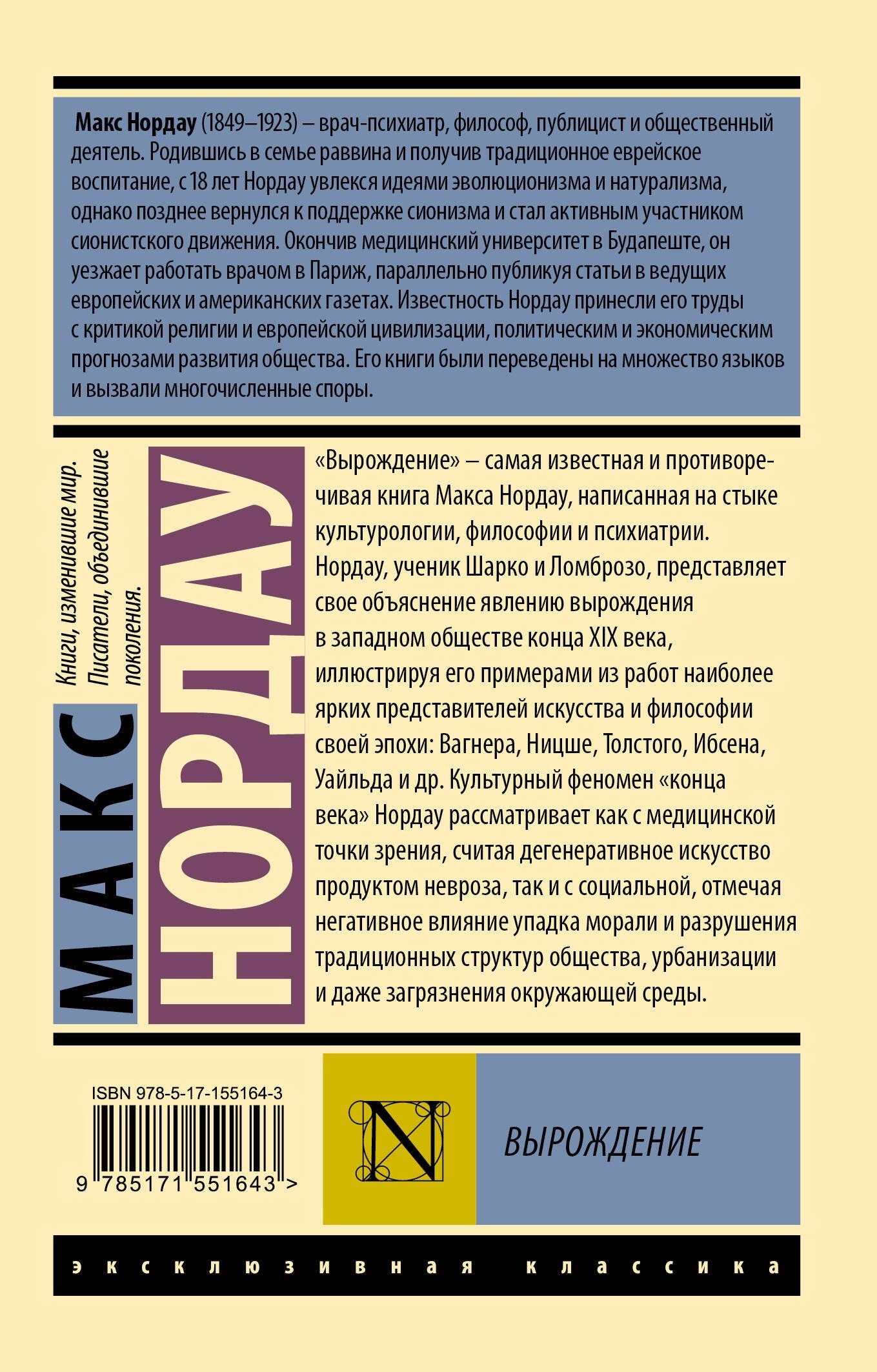 «Вырождение» – самая известная и противоречивая книга Макса Нордау, написанная на стыке культурологии, философии и психиатрии. Нордау, ученик Шарко и Ломброзо, представляет свое объяснение явлению вырождения в западном обществе конца XIX века, иллюстрируя его примерами из работ наиболее ярких представителей искусства и философии своей эпохи: Вагнера, Ницше, Толстого, Ибсена, Уайльда и др. Культурный феномен «конца века» Нордау рассматривает как с медицинской точки зрения, считая дегенеративное искусство продуктом невроза, так и c социальной, отмечая негативное влияние упадка морали и разрушения традиционных структур общества, урбанизации и даже загрязнения окружающей среды.