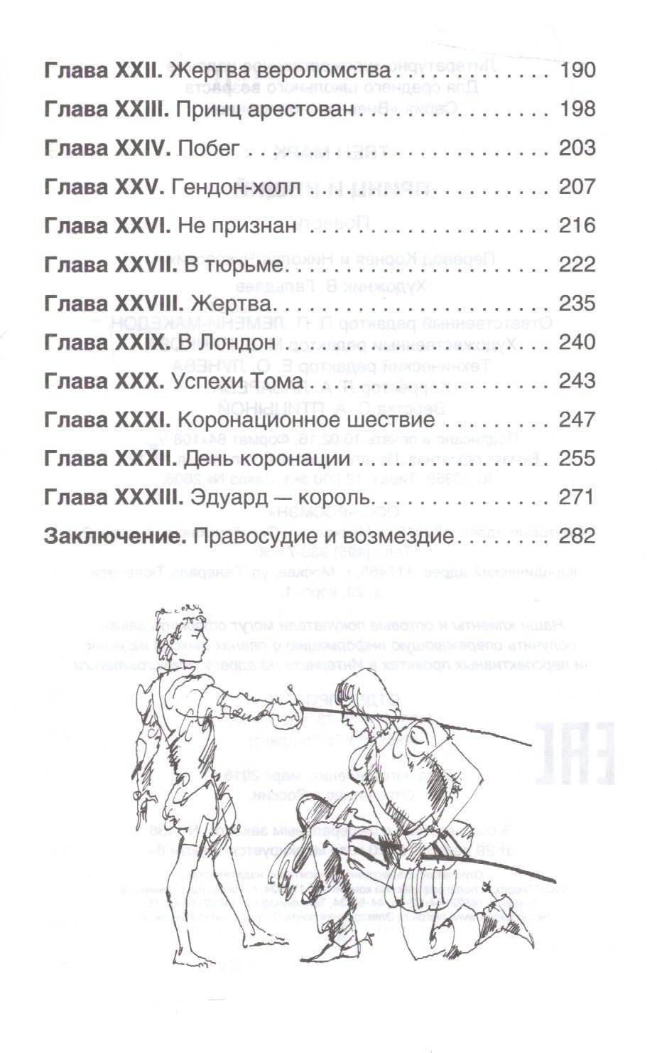 Действие исторической повести американского писателя Марка Твена разворачивается в Англии середины XVI века. Два мальчика — принц Эдуард Тюдор и нищий Том Кенти, — поразительно похожие друг на друга, однажды меняются местами. Принцу предстоит испытать все тяготы жизни своих беднейших подданных, а нищему — столкнуться с непростыми законами дворцовой жизни. Но оба сумеют извлечь из своих приключений важные уроки, проявив при этом смелость и великодушие.