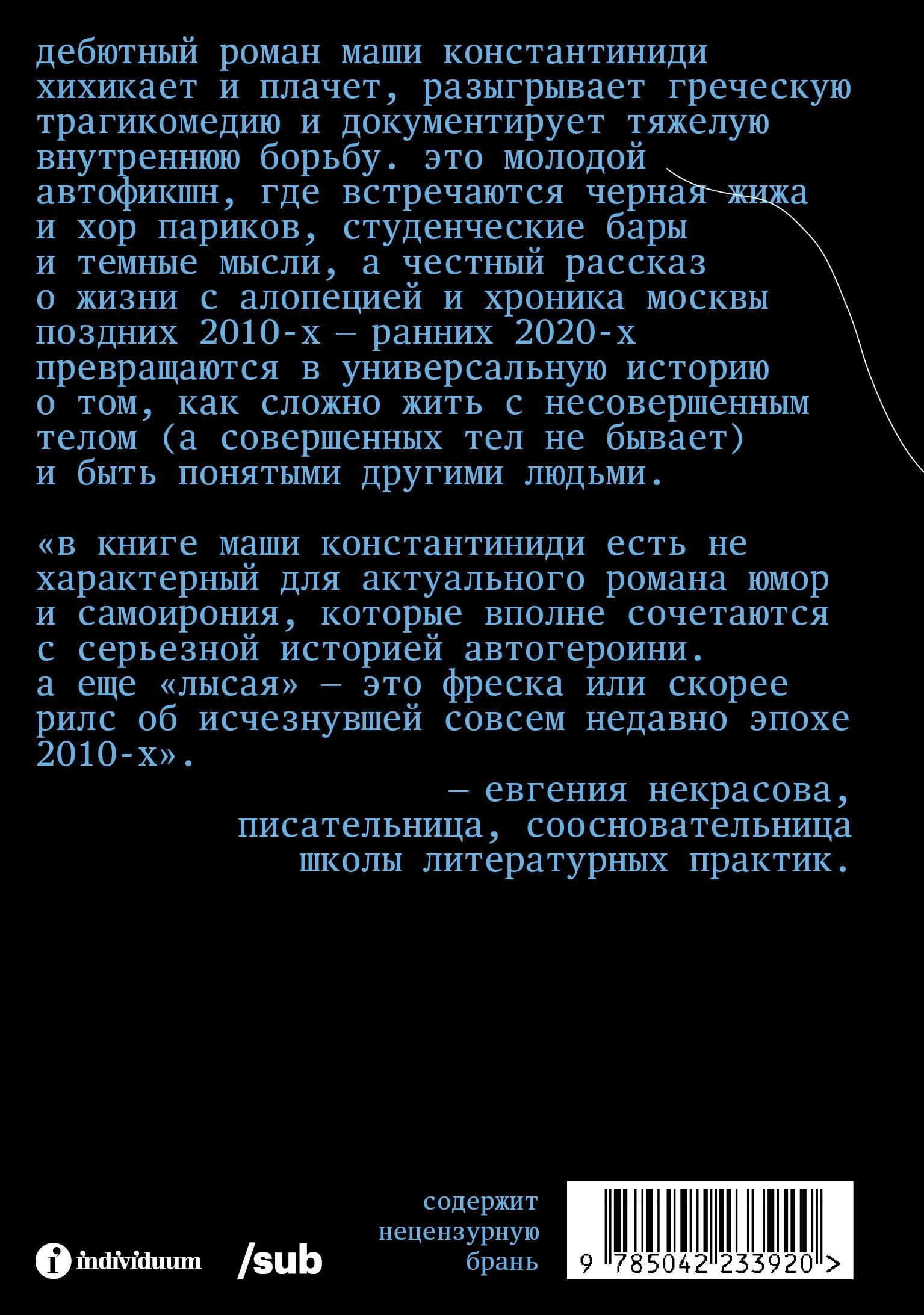 Дебютный роман Маши Константиниди хихикает и плачет, разыгрывает греческую трагикомедию и документирует тяжелую внутреннюю борьбу. Это молодой автофикшн, где встречаются черная жижа и хор париков, студенческие бары и темные мысли, а честный рассказ о жизни с алопецией и хроника Москвы поздних 2010‑х — ранних 2020‑х превращаются в универсальную историю о том, как сложно жить с несовершенным телом (а совершенных тел не бывает) и быть понятыми другими людьми.