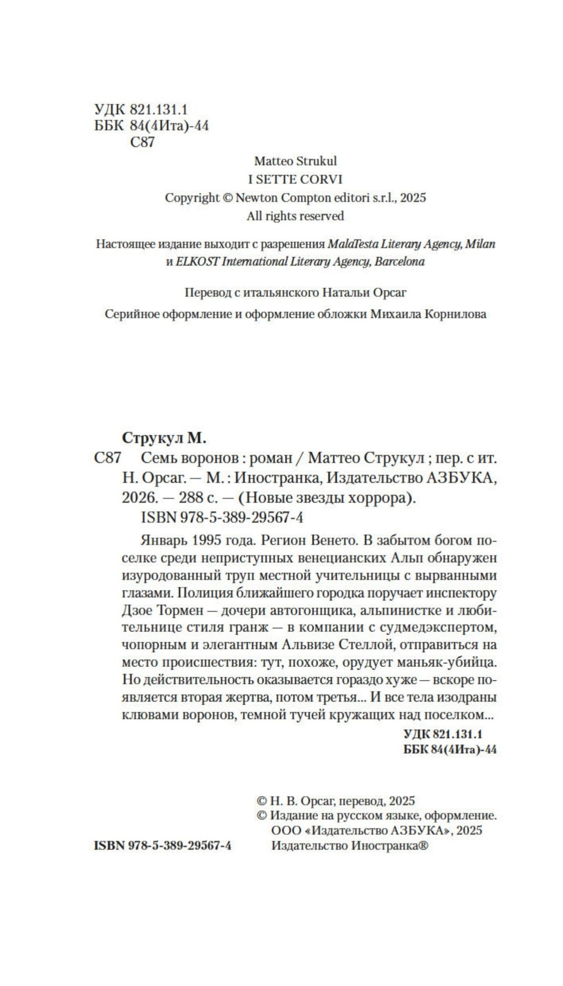 Январь 1995 года. Регион Венето. В забытом богом поселке среди неприступных венецианских Альп обнаружен изуродованный труп местной учительницы с вырванными глазами. Полиция ближайшего городка поручает инспектору Зои Тормен — дочери автогонщика, альпинистке и любительнице стиля гранж — в компании с судмедэкспертом, чопорным и элегантным Альвизе Стеллой, отправиться на место происшествия: тут, похоже, орудует маньяк-убийца. Но действительность оказывается гораздо хуже — вскоре появляется вторая жертва, потом третья… И все тела изодраны клювами воронов, темной тучей кружащих над поселком…