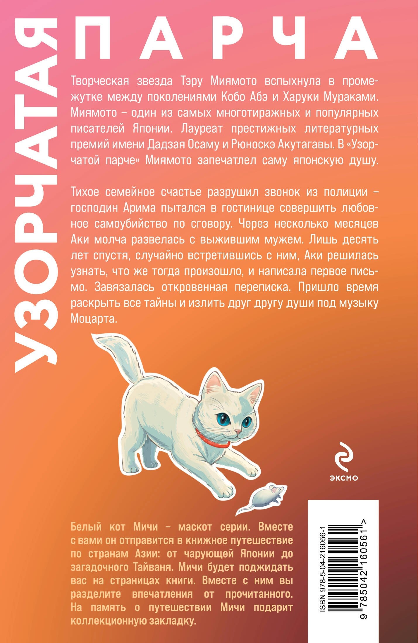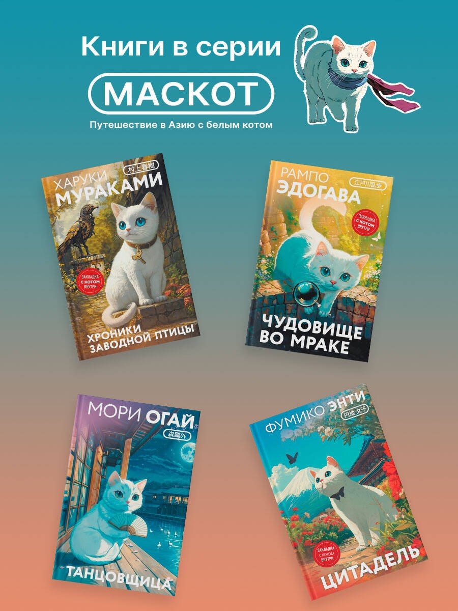 Белый кот Мичи — маскот серии. Вместе с вами он оправится в книжное путешествие по странам Азии: от чарующей Японии до загадочного Тайваня. Мичи будет поджидать вас на страницах книги. Вместе с ним вы разделите впечатления от прочитанного. На память о путешествии Мичи подарит коллекционную закладку.