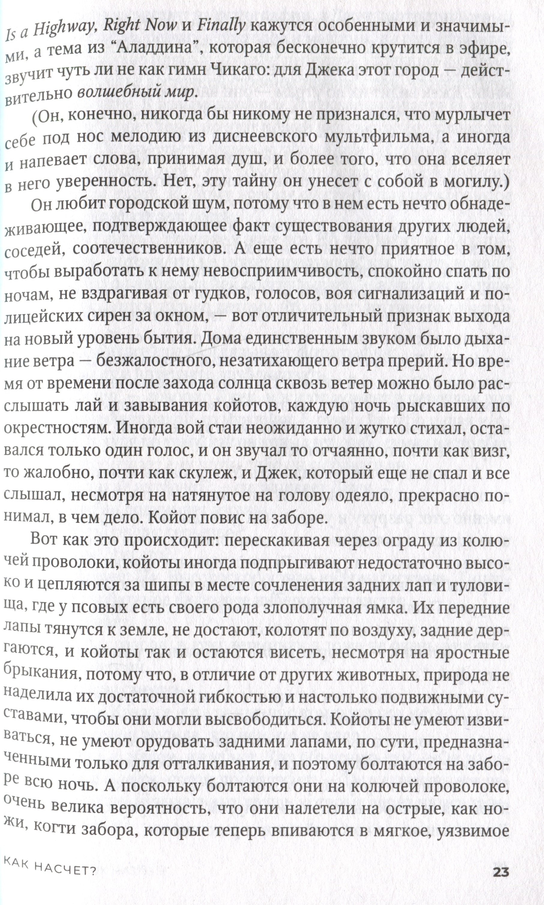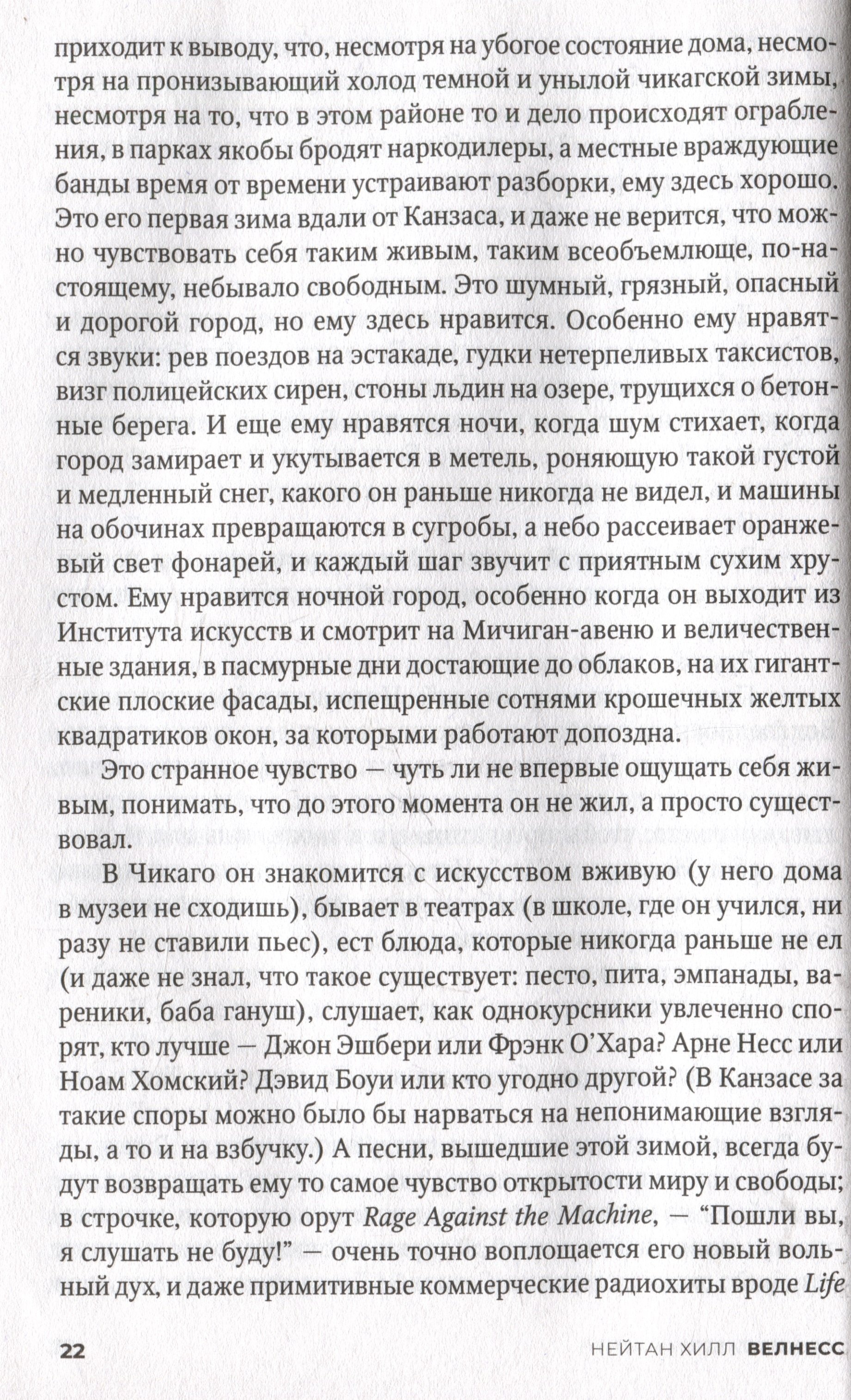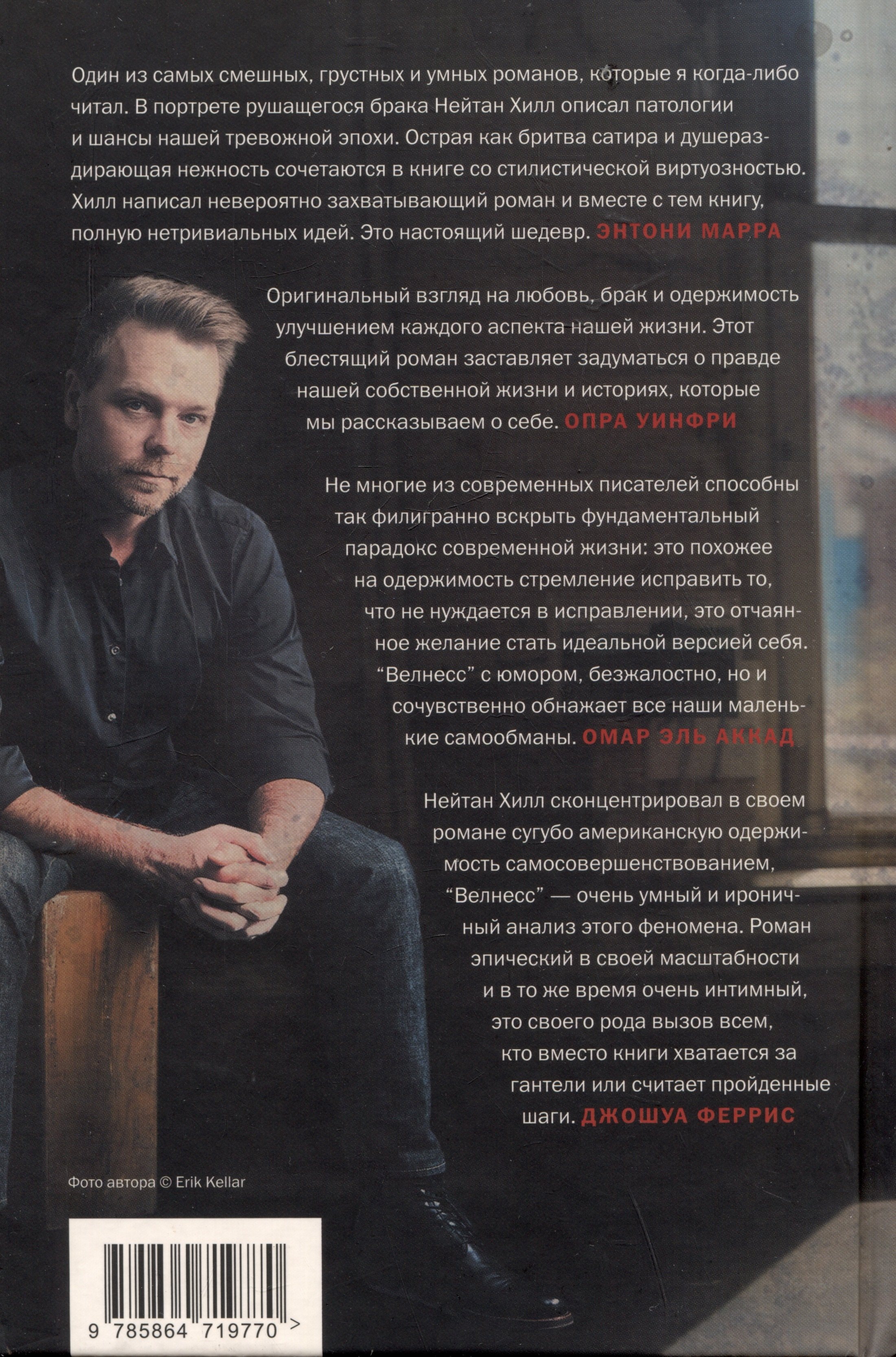 Джек — нищий художник, творящий мало кому доступное искусство. Элизабет — беглянка из баснословно богатой семьи, образ жизни которой она презирает. Их окна разделены лишь узким проулком. Неделями и месяцами они подсматривают друг за другом, восхищаясь и считая, что человек в окне напротив никогда не заинтересуется тем, кто сейчас за ним наблюдает. Оба решили начать жизнь с чистого листа в Чикаго и теперь пытаются встроиться в мир, который им чужд. Оба бесконечно одиноки и мечтают о встрече с родственной душой, не подозревая, что родственная душа обитает в соседнем доме. Спустя двадцать лет Джек и Элизабет — респектабельная пара, переживающая кризис среднего возраста. Но они остались все теми же неприкаянными и одинокими мечтателями, как и в юности, и все так же сражаются с демонами, от которых когда-то хотели сбежать. Пытаясь разобраться в себе, каждый из них начинает глубинные раскопки собственной души, рискуя потерять лучшее, что у них есть, — друг друга. Пронзительный и остроумный роман о взрослении, браке, попытках сбежать от прошлого, о том, как одержимость в стремлении стать лучшей версией себя порой заводит людей в тупик. О том, как подмена живых чувств психологическими практиками оборачивается то комедией, то трагедией. Разбирая нелепости современного общества, “Велнесс” иронично и до интимности трогательно переосмысливает классическую историю любви.“Велнесс” — красивый, порой грустный, порой оглушительно смешной роман, но прежде всего, это честная книга о том, каким равнодушным и одновременно хрупким становится с годами человек, о том, как жизнь со временем выворачивает людей наизнанку. Это история любви и тревог нашей жизни