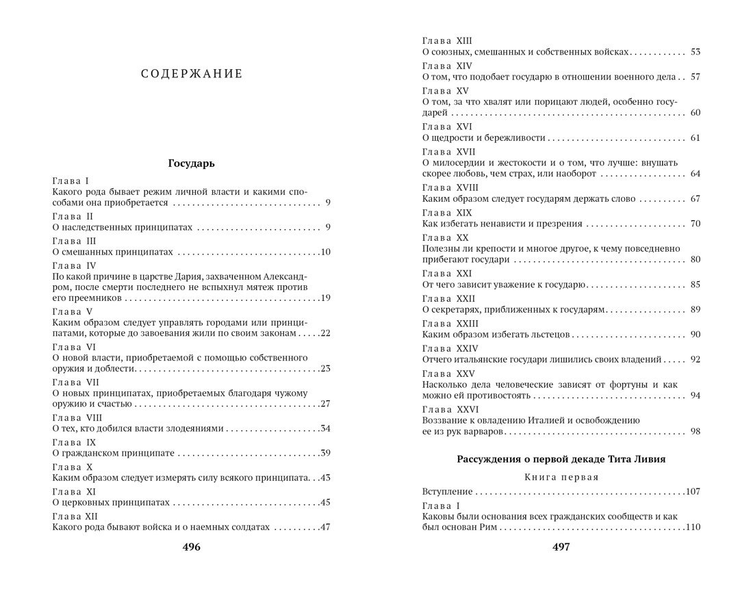 тике. Однако сегодня многие положения автора воспринимаются не столь однозначно, найдя свое воплощение в истории ХХ века. Помимо «Государя» в данном издании публикуется другая знаменитая работа Макиавелли «Рас- суждения о первой декаде Тита Ливия», дополняющая и проясняющая многие моменты основного труда автора. Оба текста представлены в наиболее современном на сегодняшний день переводе и снабжены примечаниями.
