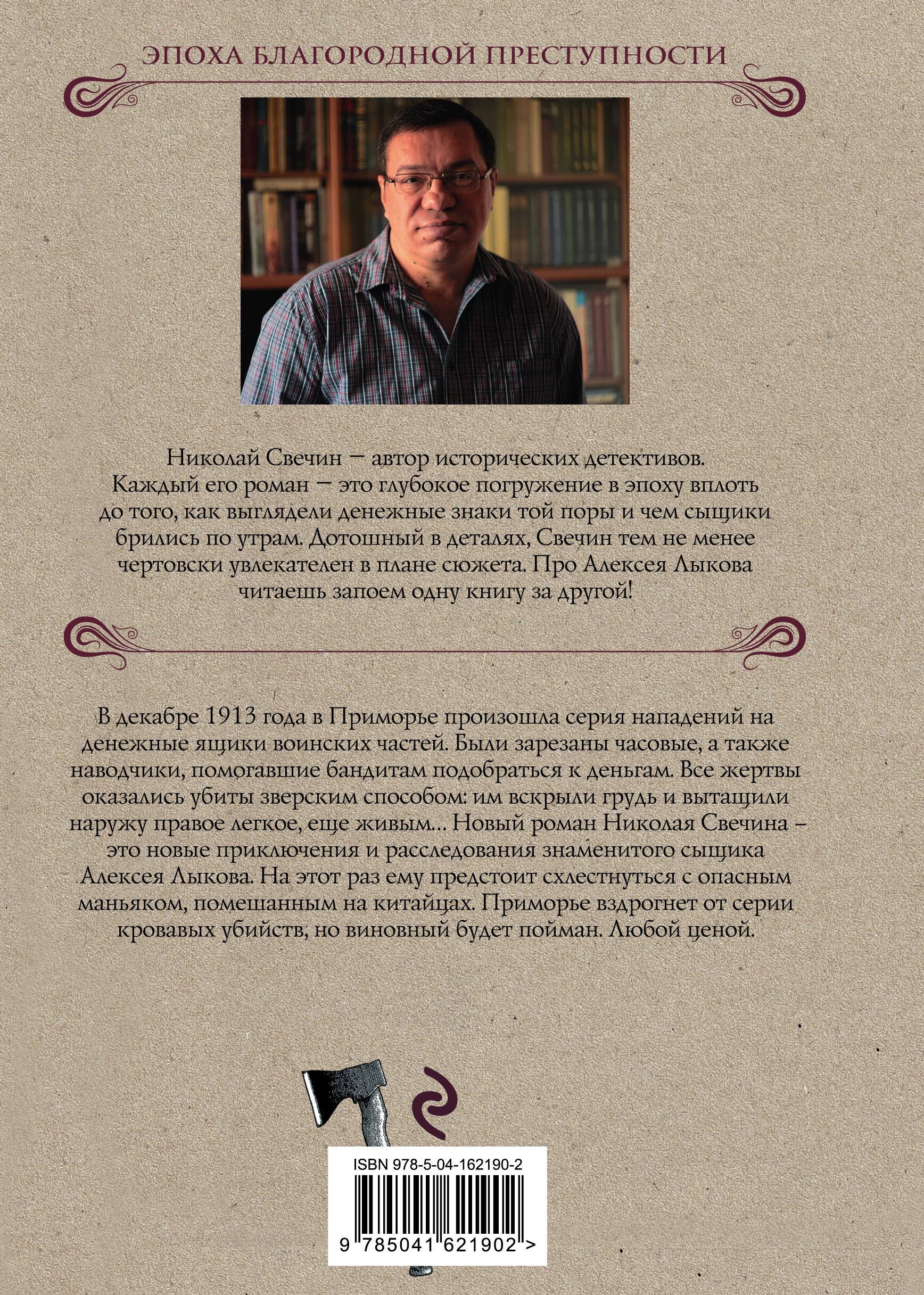 Новый роман Николая Свечина — это новые приключения и расследования знаменитого сыщика Алексея Лыкова. На этот раз ему предстоит схлестнуться с опасным маньяком, помешанном на китайцах. Приморье вздрогнет от серии кровавых убийств, но виновный будет пойман. Любой ценой.