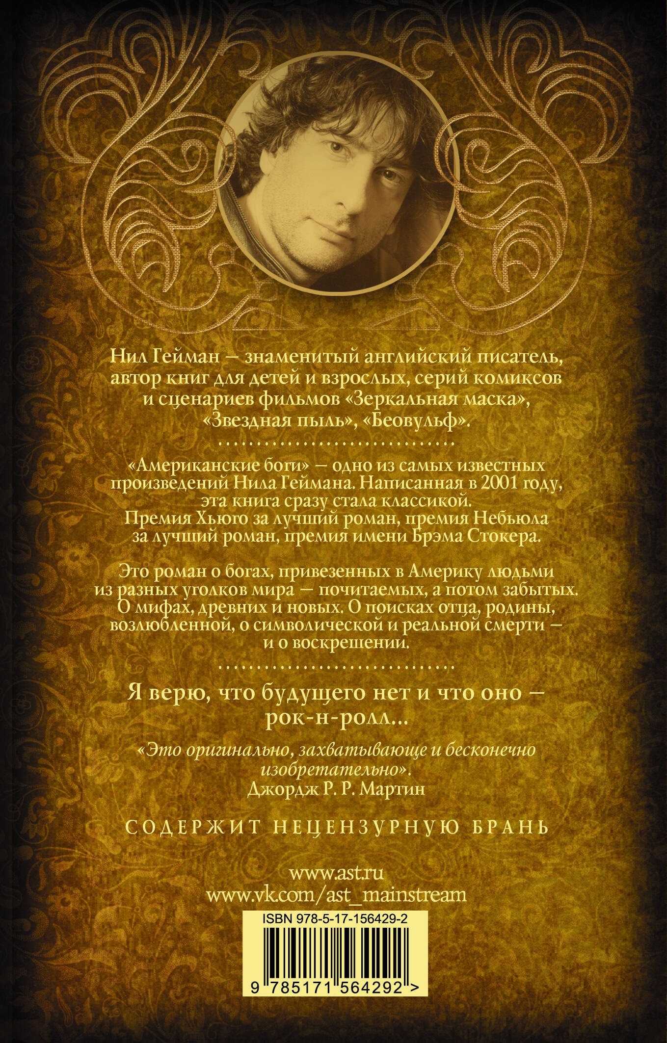 "Американские боги" - одно из самых известных произведений Геймана. Это роман о богах, привезенных в Америку людьми из разных уголков мира, почитаемых, а потом забытых, и о том, к чему не может остаться равнодушным ни один мужчина: о поисках отца, родины, возлюбленной, о символической и реальной смерти.