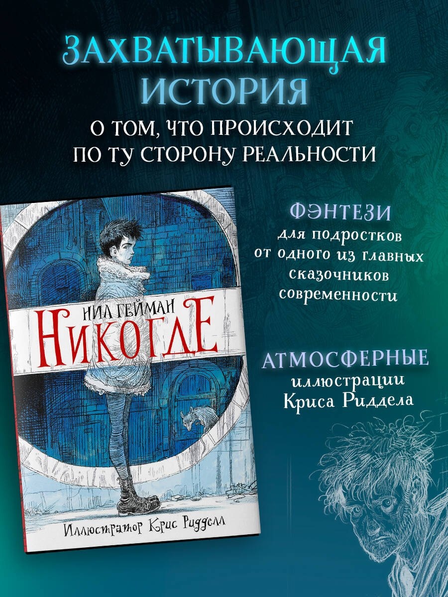 Новое уникальное издание культового романа Нила Геймана «Никогде». Блестящий дебют одного из самых популярных писателей в мире. Эта книга более двадцати лет не перестает удивлять фанатов и покорять новые поколения читателей. Невероятный мир подземного города, реальность и миф, сногсшибательные сюжетные повороты и постоянное напряжение, чисто английский юмор и по-настоящему высокая трагедия. Сотни переизданий по всему миру, неизменно высокие рейтинги продаж, но в этот раз всех ждет настоящий сюрприз. Сто сорок иллюстраций от известнейшего книжного художника Криса Риддела в мельчайших подробностях воссоздают всю географию Нижнего Лондона и представят каждого героя крупным планом. Будьте уверены, теперь вы знаете в лицо всех обитателей таинственного London Underground! И уж точно не заблудитесь, если случайно откроете дверь, ведущую в удивительный мир «Никогде». А для самых преданных поклонников в издание включено интервью с Нилом Гейманом, в котором он расскажет, какие у него самые любимые станции метро, и новый перевод новеллы «Как маркиз получил свой плащ назад».